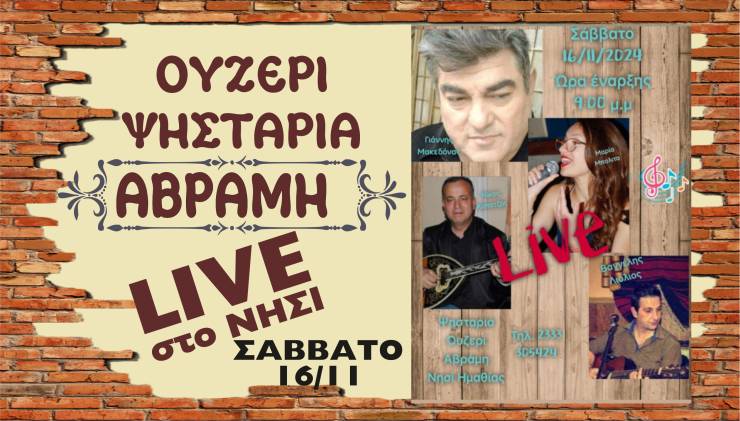 Το Σάββατο 16 Νοεμβρίου 2024 έρχεται μοναδική LIVE βραδιά στην Ψησταριά - Ουζερί ΑΒΡΑΜΗ στο Νησί Ημαθίας
