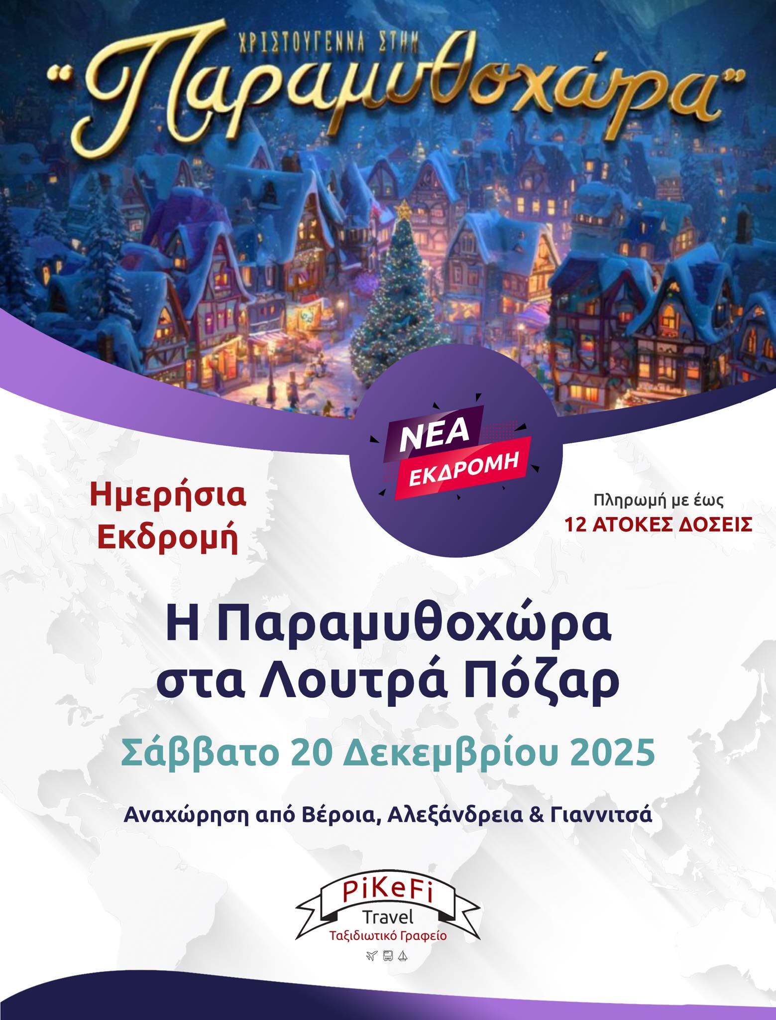 Το Σάββατο 20 Δεκεμβρίου, αναχωρούμε το μεσημεράκι γύρω στις 15:00, γιατί μας περιμένει μία μαγική Παραμυθοχώρα για να γίνουμε παιδιά με τη μαγεία των Χριστουγέννων.