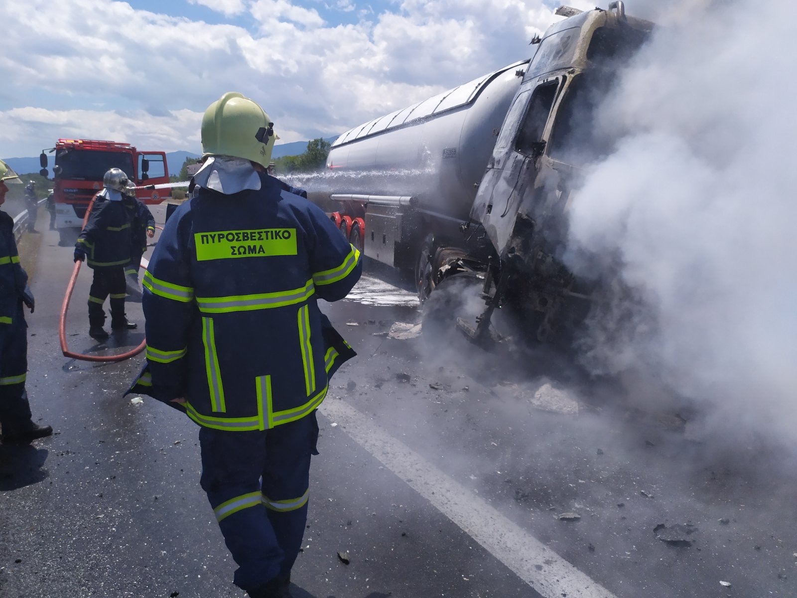 Φριχτό θάνατο βρήκε 44χρονος οδηγός βυτιοφόρου, που τυλίχθηκε στις φλόγες ύστερα από τροχαίο δυστύχημα στην Εθνική Οδό Αθηνών Θεσσαλονίκης, λίγα χιλιόμετρα έξω από την Κατερίνη.