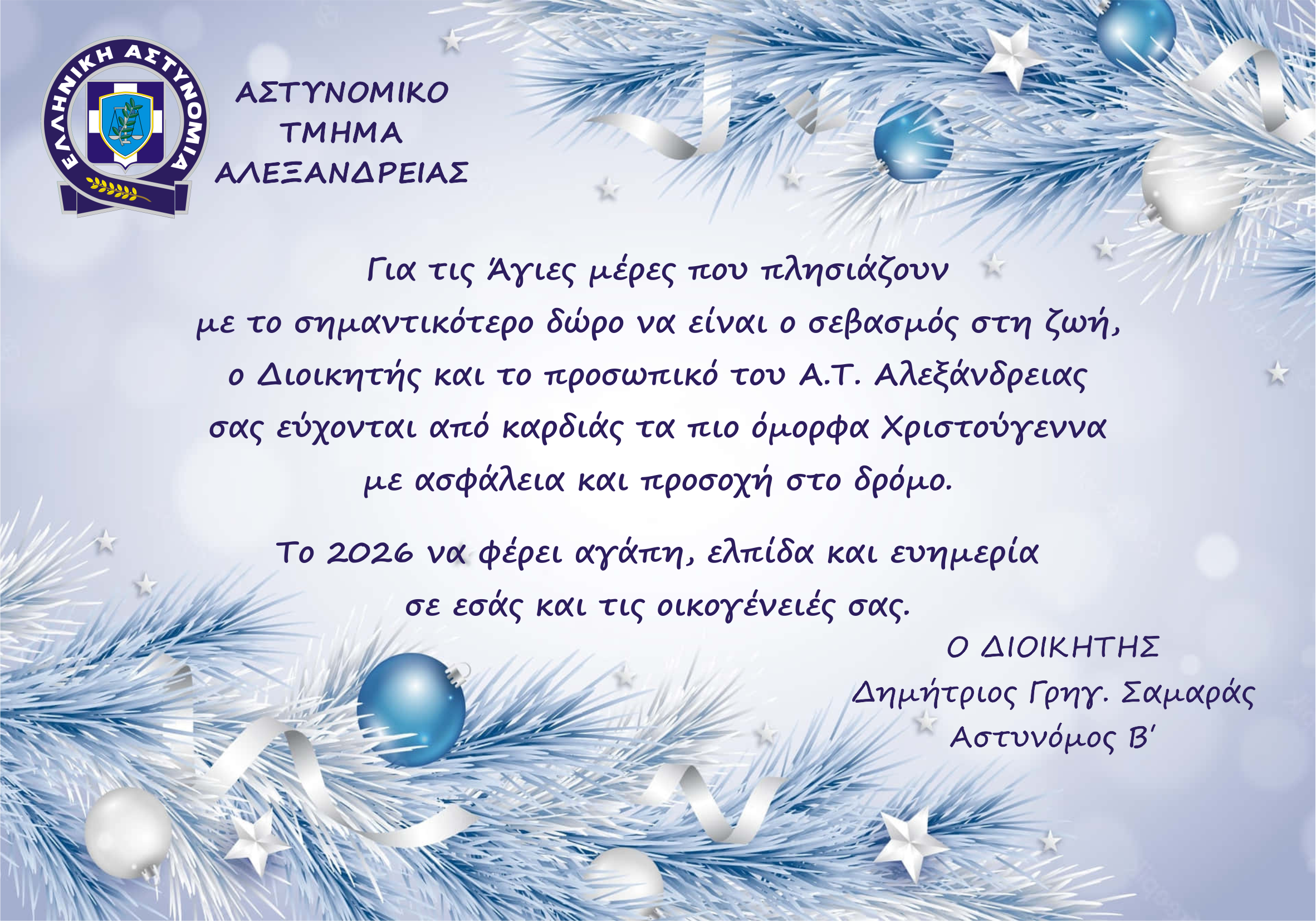 Ευχές για Καλά Χριστούγεννα και ασφαλές 2026 από το Αστυνομικό Τμήμα Αλεξάνδρειας
