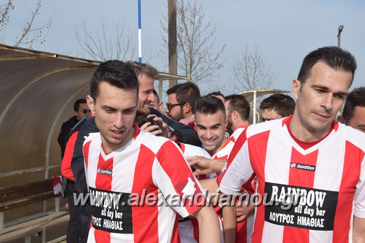 Στο 3΄ λεπτό ήρθε το πρώτο γκολ για την τοπική ομάδα με τον Τριανταφυλλόπουλο οποίος στο 19΄ σημείωσε το δεύτερο γκολ για την ομάδα του. Στο 26΄ το τρίτο γκολ με τον Παπαδόπουλο Δημήτρη ,στο 31΄ το τέταρτο γκολ με τον Αναστασόπουλο 38΄ το πέμπτο γκολ με τον Τζιλιόπουλο Διονύση. Στην επανάληψη το τρίτο προσωπικό γκολ για τον Τριανταφυλλόπουλο και έκτο για τον Ολυμπιακό Λουτρού ήρθε στο 47ο λεπτό και να κλείσει ο ''χορός΄΄ των τερμάτων στο 75 με ένα γκολ του Καραγκούνη.