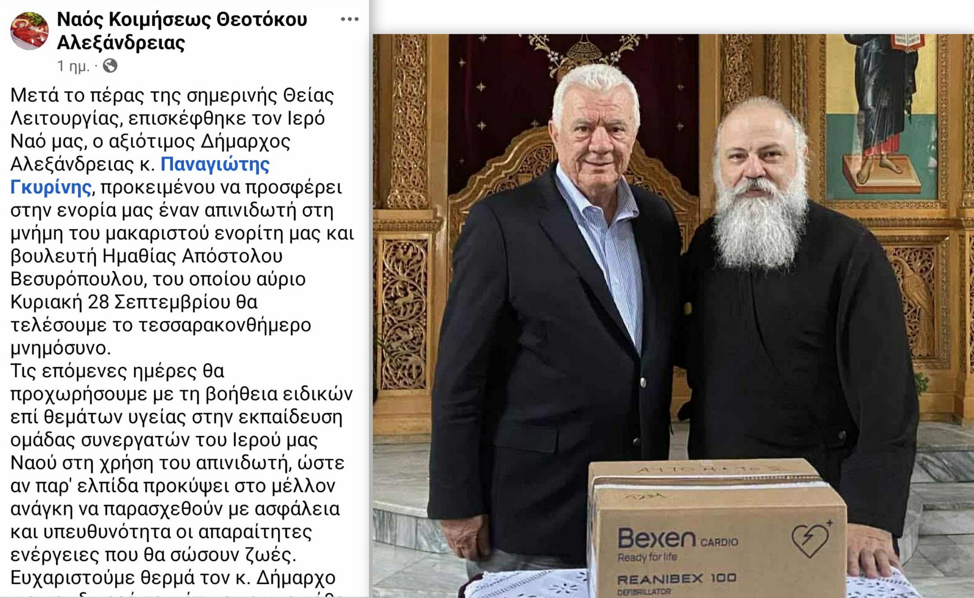 Πρόσφερε λοιπόν ο δήμαρχός μας έναν απινιδωτή στην εκκλησία της Παναγίας στην Αλεξάνδρεια στη μνήμη του Αποστόλη Βεσυρόπουλου. Μέχρις εδώ όλα καλά και μπράβο στον δήμαρχο. Εγώ θα κάνω μια ερώτηση. 28 του μήνα ήταν το μνημόσυνο και ο απινιδωτής χαρίστηκε στις 27, δηλαδή μια μέρα πριν. Σας λέει κάτι αυτό ή μόνο στα δικά μου αυτιά κουδούνισε συναγερμός;