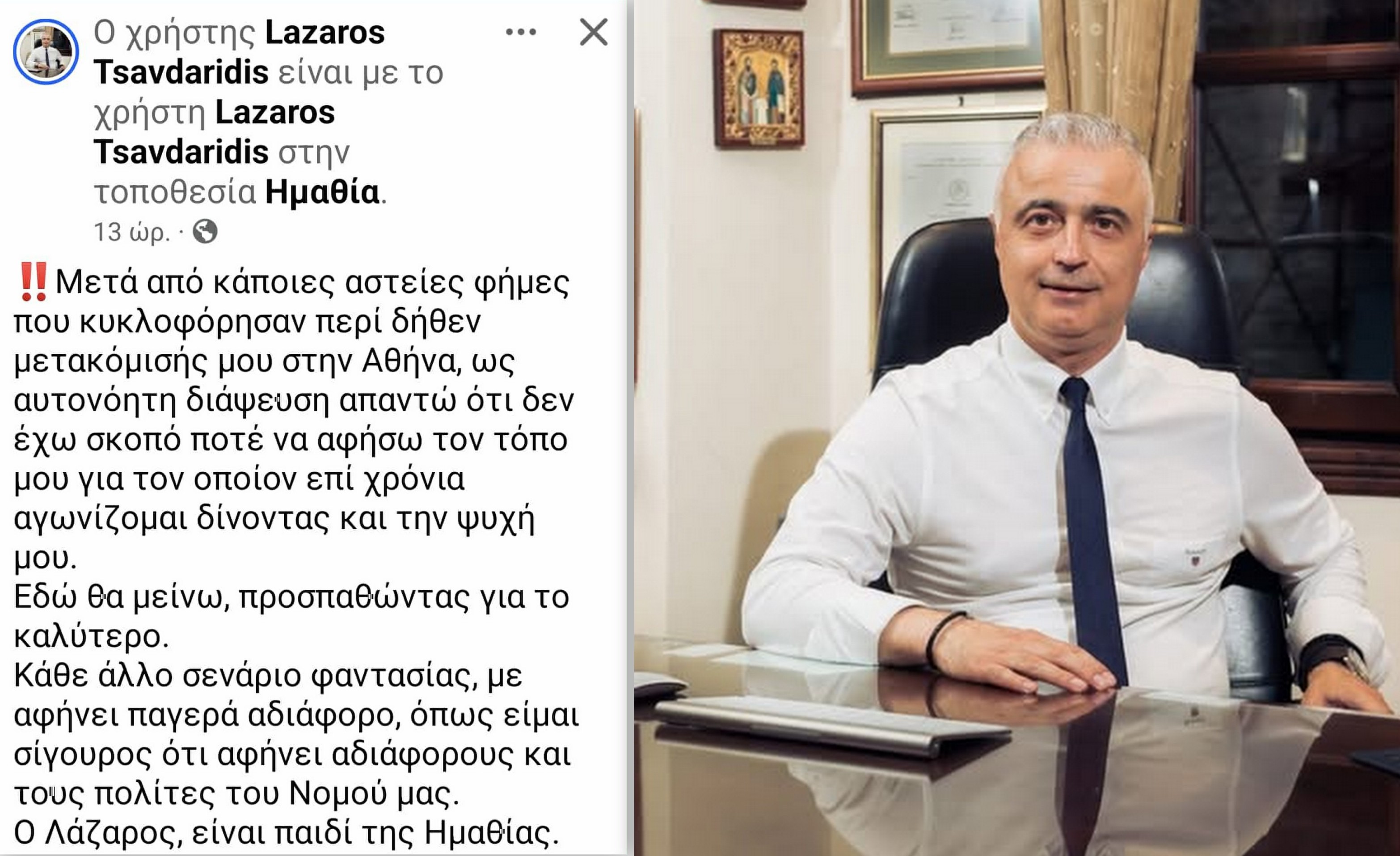 Μόνο ο Λάζαρος δεν πάει πουθενά. Βρέξει, χιονίσει αυτός είναι παιδί της Ημαθίας. Κυκλοφόρησαν κάποιες φήμες ότι αγόρασε σπίτι στην Αθήνα και ότι σιγά σιγά σκέφτεται να την κάνει προς τα εκεί. Τούρκεψε όταν το έμαθε. Τι post ανέβασε να μας πει ότι δεν το κουνάει ρούπι, τι σποτάκι ετοίμασε να δίνει χειραψίες με Ημαθιώτες, τάχα μου δεν τους αλλάζει με τίποτα. Μακάρι βρε Λάζαρε θα πω εγώ αλλά θα σου θυμίσω ότι τα ίδια έλεγε και ο…. Χρυσοχοΐδης. Τώρα που είστε και στο ίδιο κόμμα ρώτα τον να μάθουμε και μεις το γιατί.