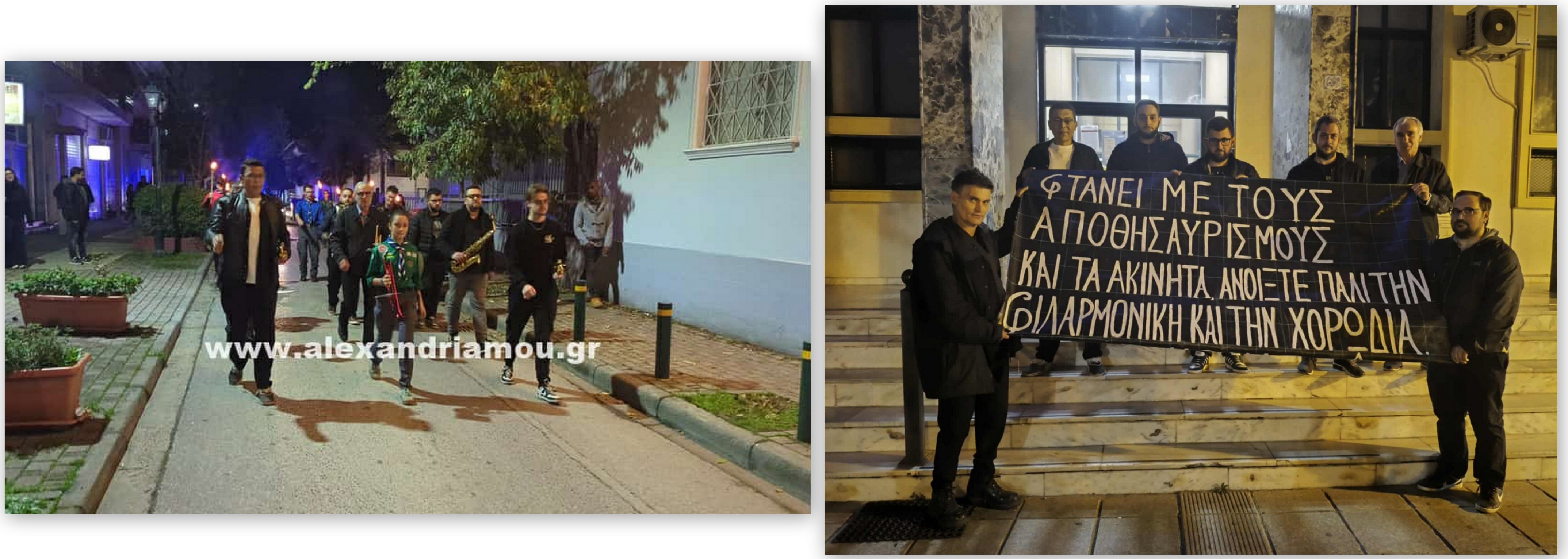 Το ίδιο βράδυ, άλλη μια ομάδα βγήκε στους δρόμους της πόλης να διαμαρτυρηθεί. Όχι για τη Παλαιστίνη αλλά για τον δικό τους Γολγοθά που ανεβαίνουν εδώ και 2,5 χρόνια. Η πρώην φιλαρμονική ορχήστρα του δήμου μας συνόδευσε τους προσκόπους στη νυχτερινή τους λαμπαδηδρομία και ταυτόχρονα διαμαρτυρήθηκε έξω από το δημαρχείο για όλη αυτή την κοροϊδία που τρώνε τόσο καιρό.