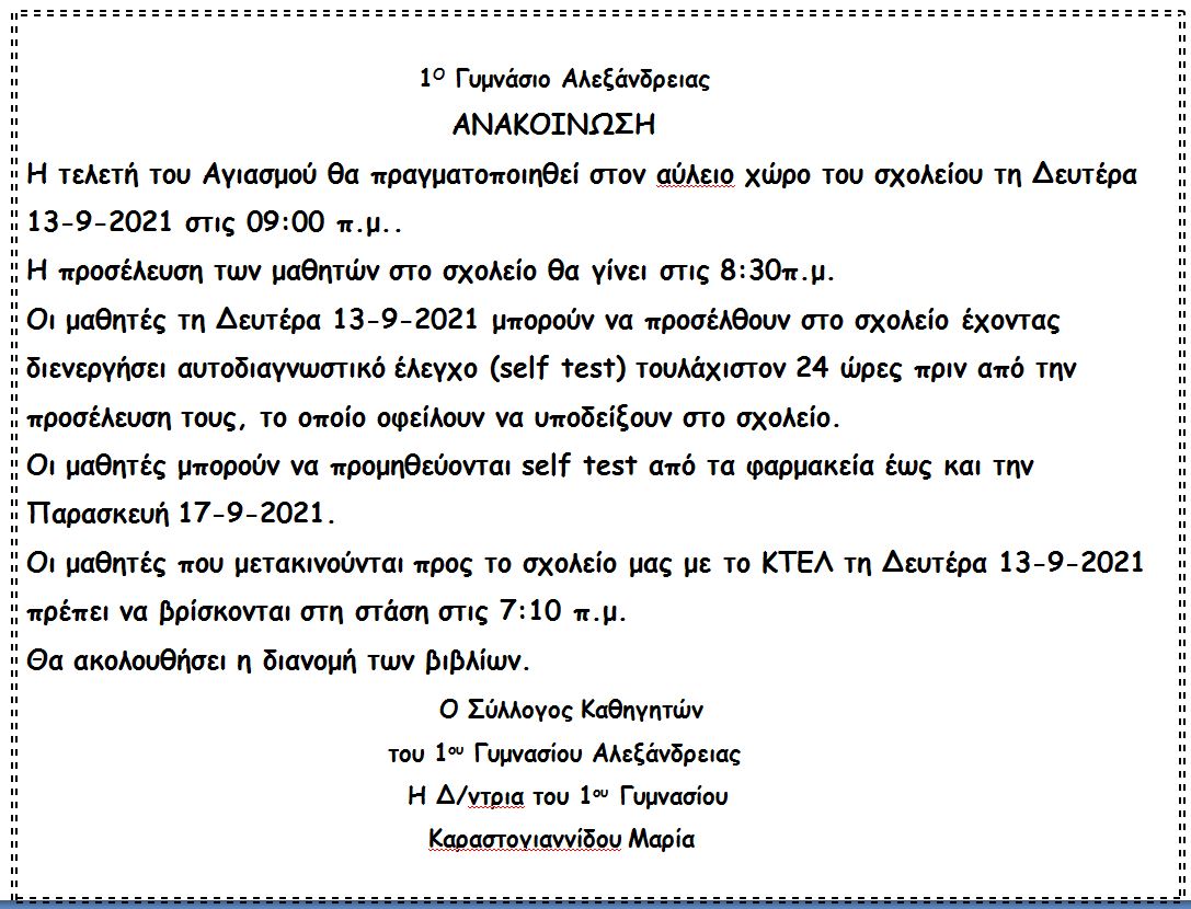 Πώς θα γίνει ο αγιασμός στο 1ο Γυμνάσιο Αλεξάνδρειας - Πώς θα προσέλθουν οι μαθητές