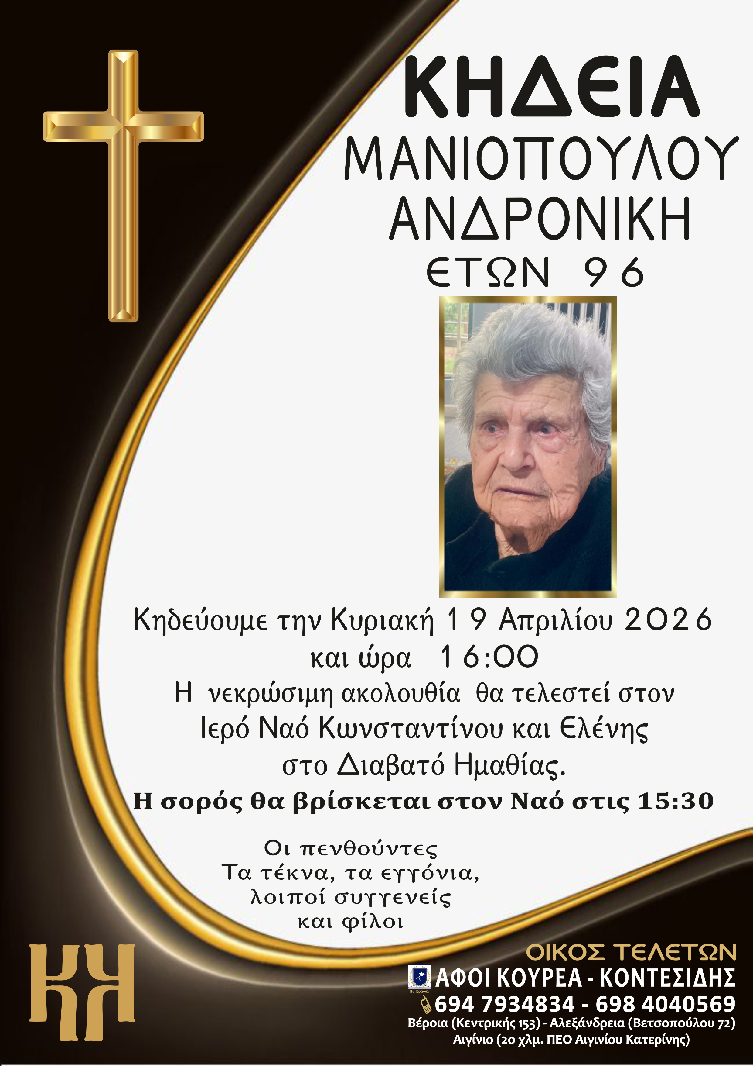 Η κηδεία της θα τελεστεί την Κυριακή 19 Απριλίου 2026 και ώρα 16:00,