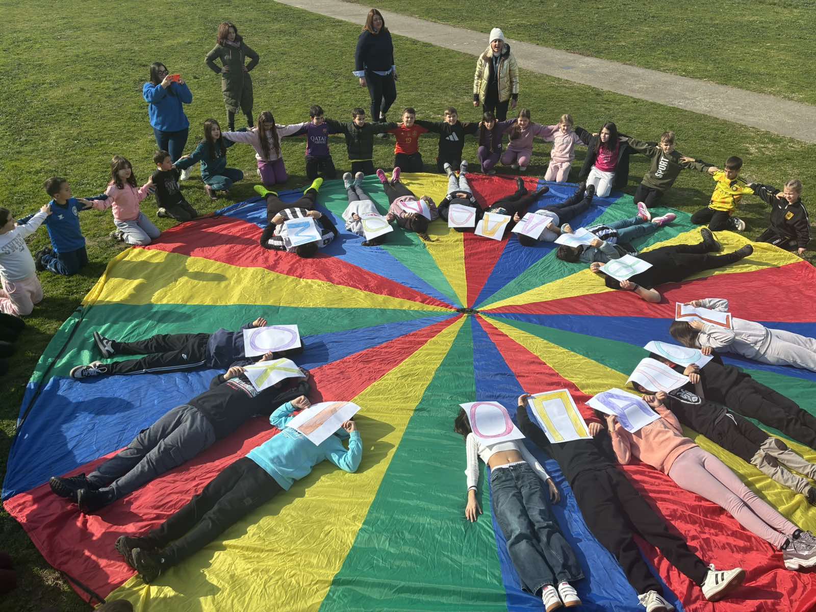 Ακολούθησε μια συμβολική δράση: οι μαθητές έγραψαν λέξεις που εκφράζουν το ευ αγωνίζεσθαι—αγάπη, συνεργασία, αλληλεγγύη, συμπερίληψη—και τις άφησαν να «ταξιδέψουν» στον ουρανό, μεταφέροντας το μήνυμα όσο πιο μακριά γίνεται. Τέλος, όλα τα παιδιά σχημάτισαν πάνω στο αερόστατο των χρωμάτων το σύνθημα: «Φίλαθλος και όχι οπαδός», ολοκληρώνοντας έναν κύκλο δράσεων με ισχυρό συμβολισμό.