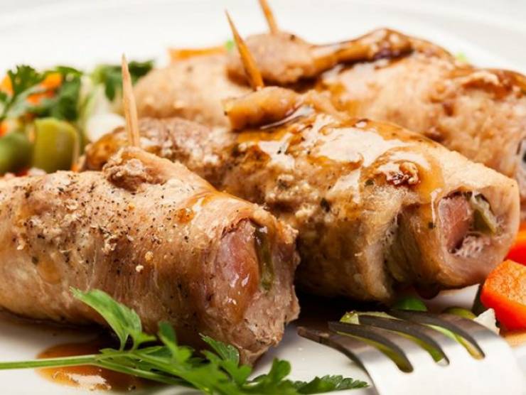 Χτυπάμε τα φιλέτα του κρέατος για να πλατύνουν, βάζουμε ανάλογη γέμιση, τα τυλίγουμε σε ρολά και τα δένουμε με κλωστή ή με δύο οδοντογλυφίδες που περνάμε κάθετα από τη μία και την άλλη πλευρά.