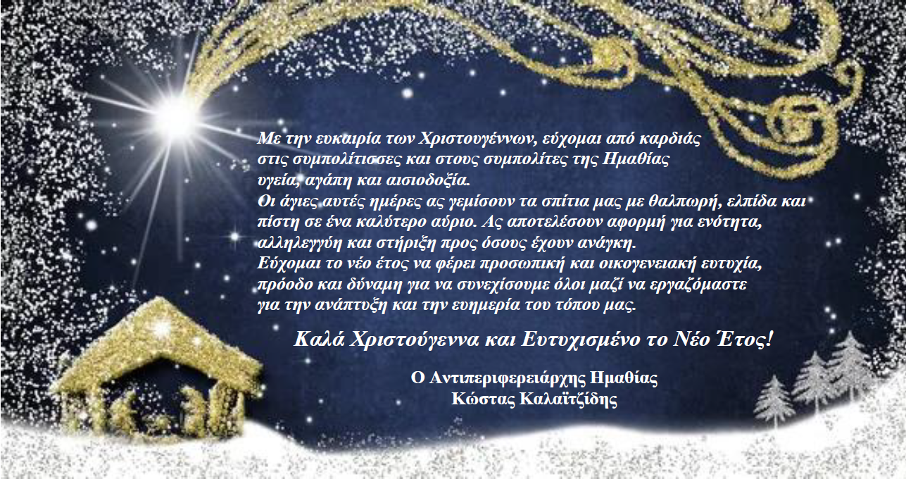 Εύχομαι από καρδιάς σε όλες τις Ημαθιώτισσες και όλους τους Ημαθιώτες υγεία, προσωπική και οικογενειακή ευτυχία, δύναμη και δημιουργικότητα. Το νέο έτος να φέρει πρόοδο, ανάπτυξη και ευημερία για τον τόπο μας.