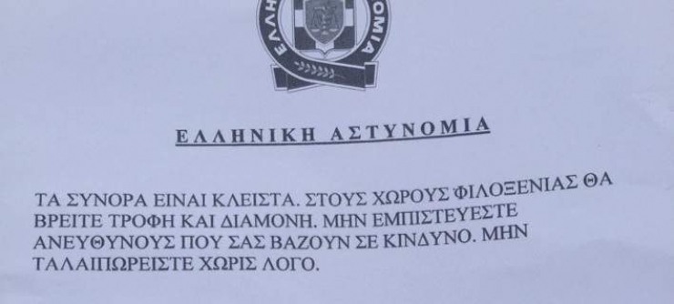 «Tα σύνορα είναι κλειστά. Στους χώρους φιλοξενίας θα βρείτε τροφή και διαμονή. Μην εμπιστεύεστε ανεύθυνους που σας βάζουν σε κίνδυνο. Μην ταλαιπωρείστε χωρίς λόγο», γράφει το φυλλάδιο με κεφαλαία γράμματα, ενώ από κάτω ακολουθεί η μετάφραση του κειμένου στα αραβικά.