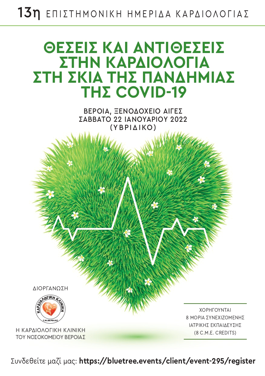 Η 13η Επιστημονική ημερίδα της Καρδιολογικής Κλινικής Νοσοκομείου Βέροιας θα πραγματοποιηθεί το Σάββατο 22 Ιανουαρίου 2022, με υβριδικό τρόπο (δια ζώσης στο ξενοδοχείο ΑΙΓΕΣ Μέλαθρον στη Βέροια και διαδικτυακά μέσω του συνδέσμου https://bluetree.events/client/event-295/register), με θέμα "ΘΕΣΕΙΣ ΚΑΙ ΑΝΤΙΘΕΣΕΙΣ ΣΤΗΝ ΚΑΡΔΙΟΛΟΓΙΑ ΣΤΗ ΣΚΙΑ ΤΗΣ ΠΑΝΔΗΜΙΑΣ ΤΗΣ COVID-19".