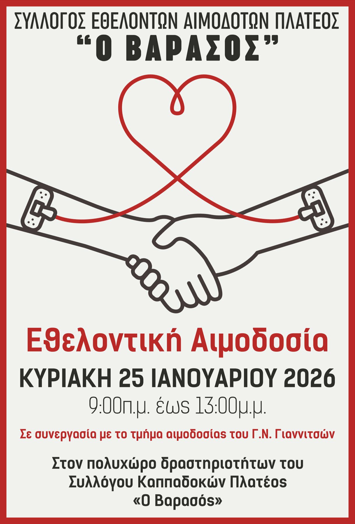 16η Εθελοντική Αιμοδοσία από τον Σύλλογο Αιμοδοτών Πλατέος Ημαθίας «Ο Βαρασός» την Κυριακή 25 Ιανουαρίου 2026 Κύριο