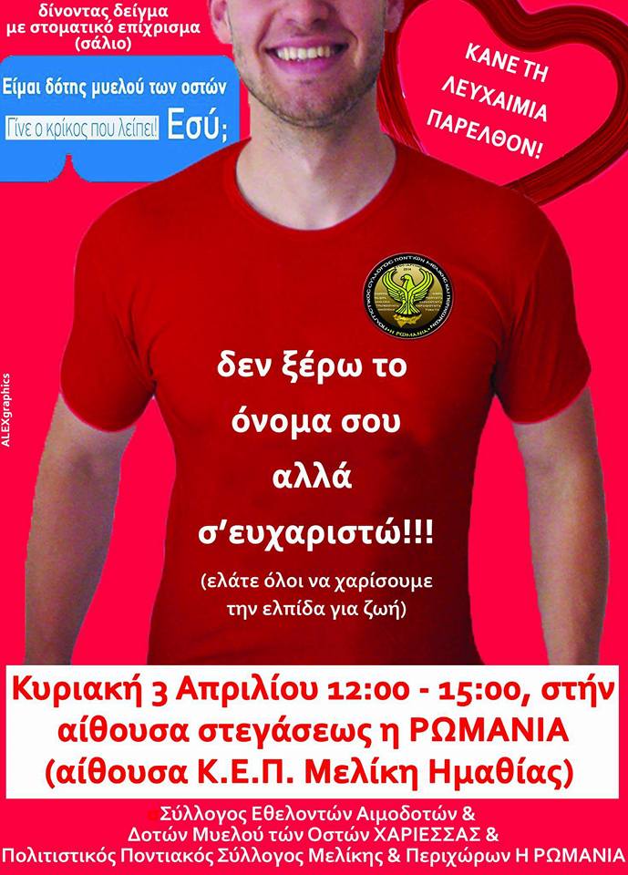 Ο Σύλλογος Εθελοντών Αιμοδοτών και Δοτών Μυελού των Οστών θα βρίσκεται την Κυριακή 3 Απριλίου 2016 στην Μελίκη Ημαθίας έπειτα από κάλεσμα του πολιτιστικού Ποντιακού Συλλόγου Μελίκης & Περιχώρων «Η Ρωμανία» για ενημέρωση και εγγραφή υποψήφιων εθελοντών Δοτών