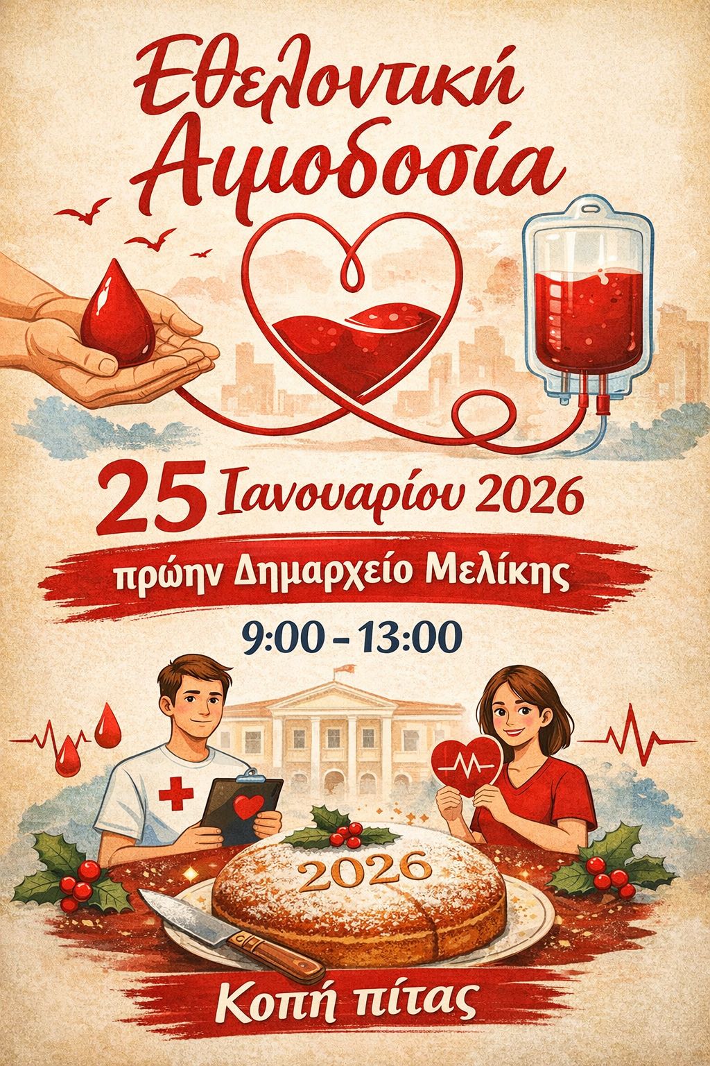 Την Κυριακή 25 Ιανουαρίου 2026, από τις 09:00 έως τις 13:00, σας περιμένει στο πρώην Δημαρχείο Μελίκης για την καθιερωμένη εθελοντική αιμοδοσία.