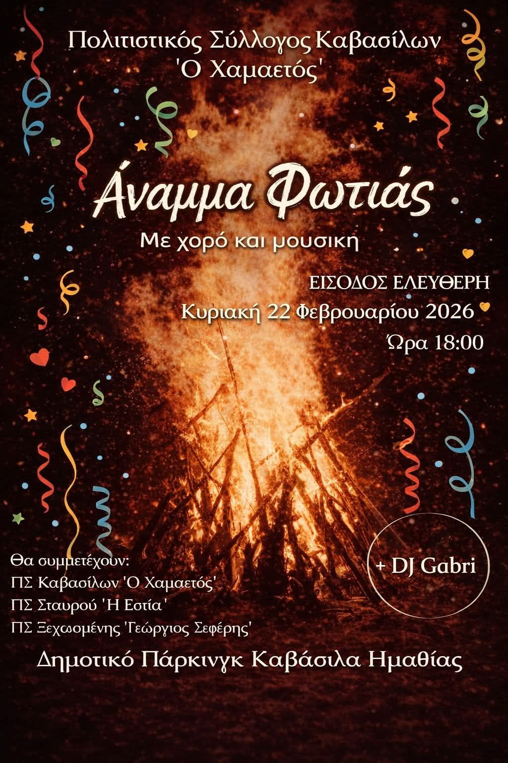 Ο Πολιτιστικός Σύλλογος Καβασίλων «Ο Χαμαετός» σας προσκαλεί σε μια ζεστή και γεμάτη ζωντάνια εκδήλωση, το Άναμμα Φωτιάς, την Κυριακή 22 Φεβρουαρίου 2026 και ώρα 18:00, στο Δημοτικό Πάρκινγκ Καβάσιλα Ημαθίας.