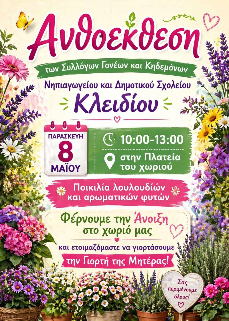 Οι Σύλλογοι Γονέων και Κηδεμόνων Νηπιαγωγείου & Δημοτικού Σχολείου Κλειδίου διοργανώνουν Ανθοέκθεση και σας προσκαλούν να καλωσορίσετε μαζί την Άνοιξη.