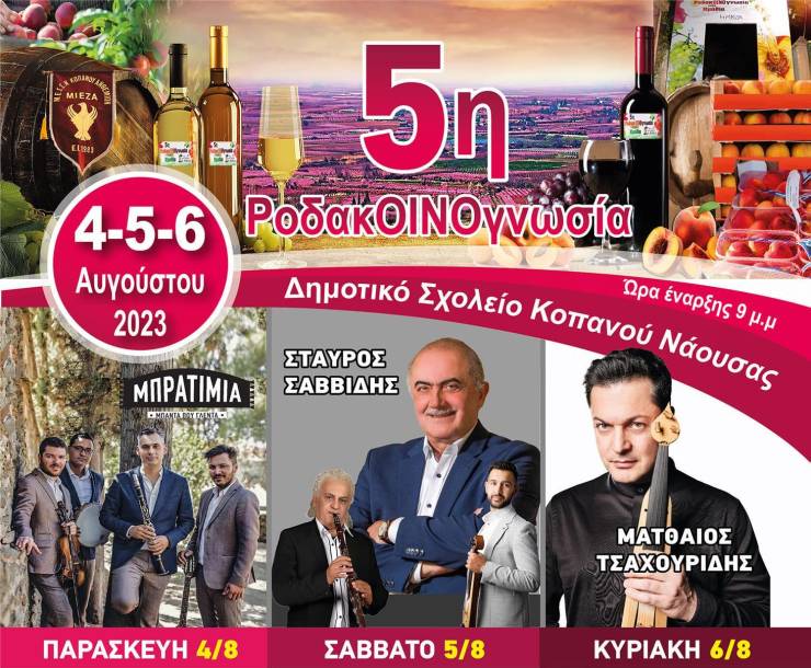 Ο Μορφωτικός Σύλλογος " Η ΜΙΕΖΑ" Κοπανού σας προσκαλεί στην 5η ΡΟΔΑΚΟΙΝΟΓΝΩΣΙΑ που θα πραγματοποιηθεί 4-5-6 Αυγούστου 2023 στον αύλειο χώρο του Δημοτικού Σχολείου Κοπανού.