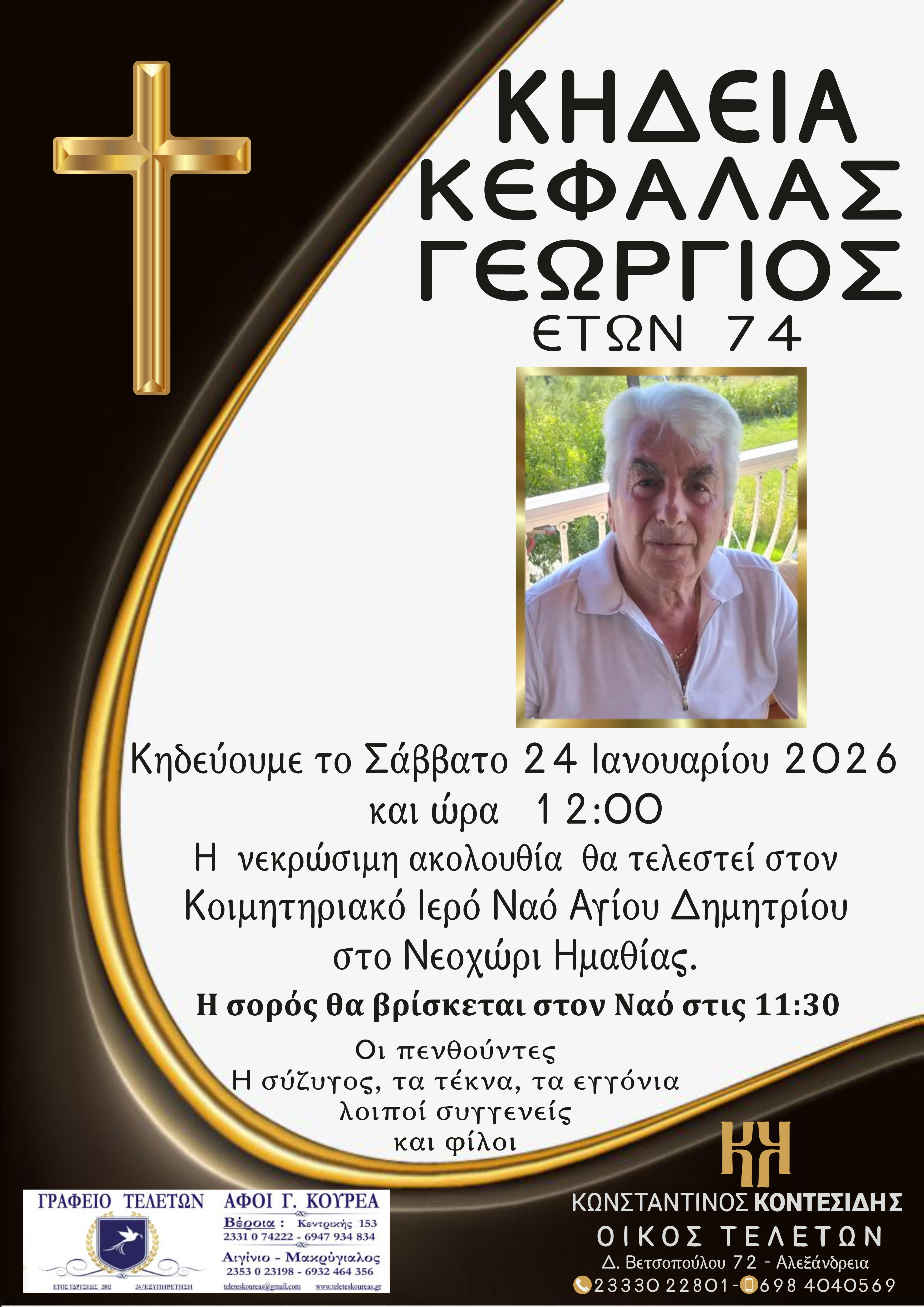 Η κηδεία του θα τελεστεί το Σάββατο 24 Ιανουαρίου 2026 και ώρα 12:00,