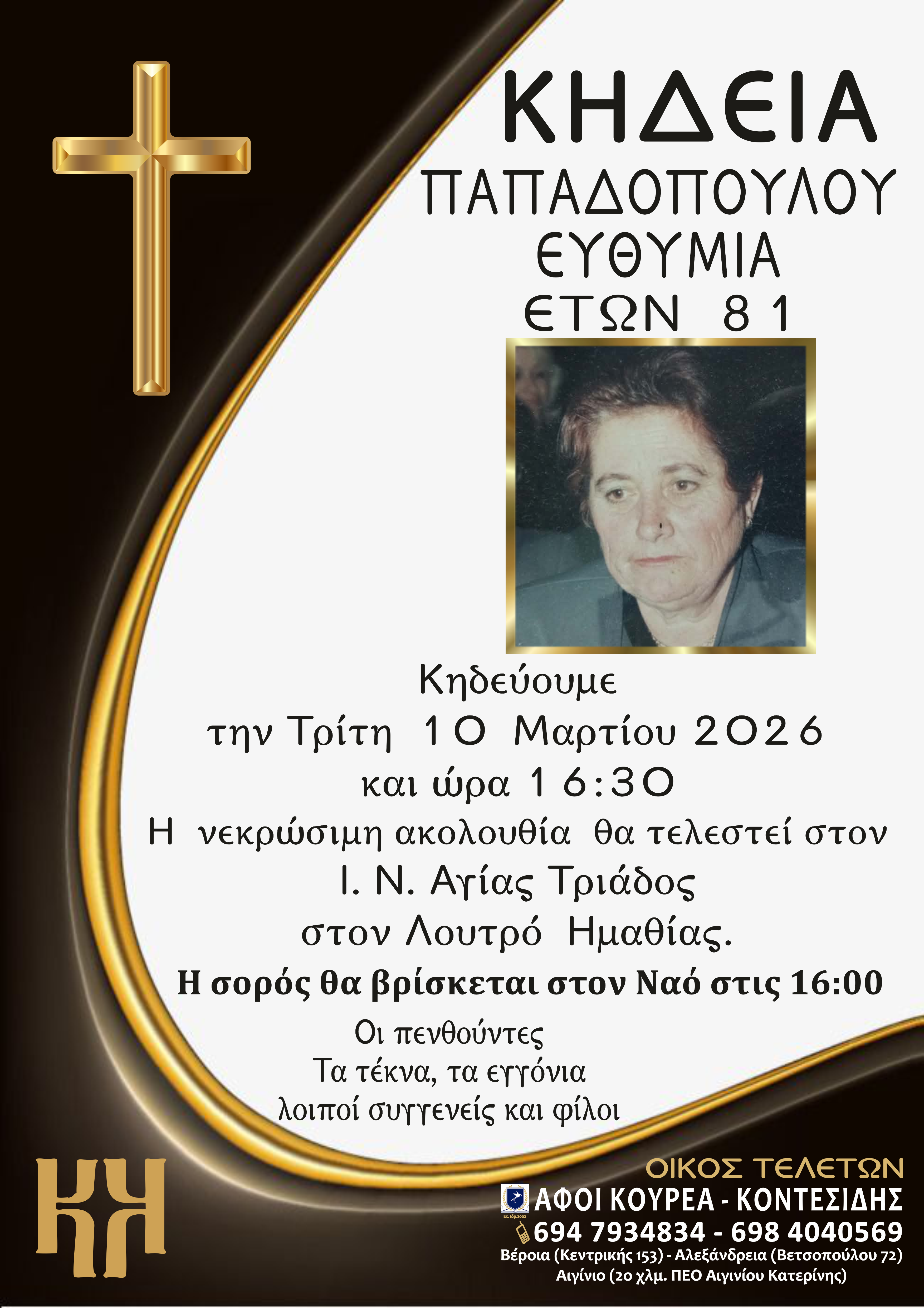 Η κηδεία της θα τελεστεί την Τρίτη 10 Μαρτίου 2026 και ώρα 16:30 στον Ιερό Ναό Αγίας Τριάδος στο Λουτρό Ημαθίας.