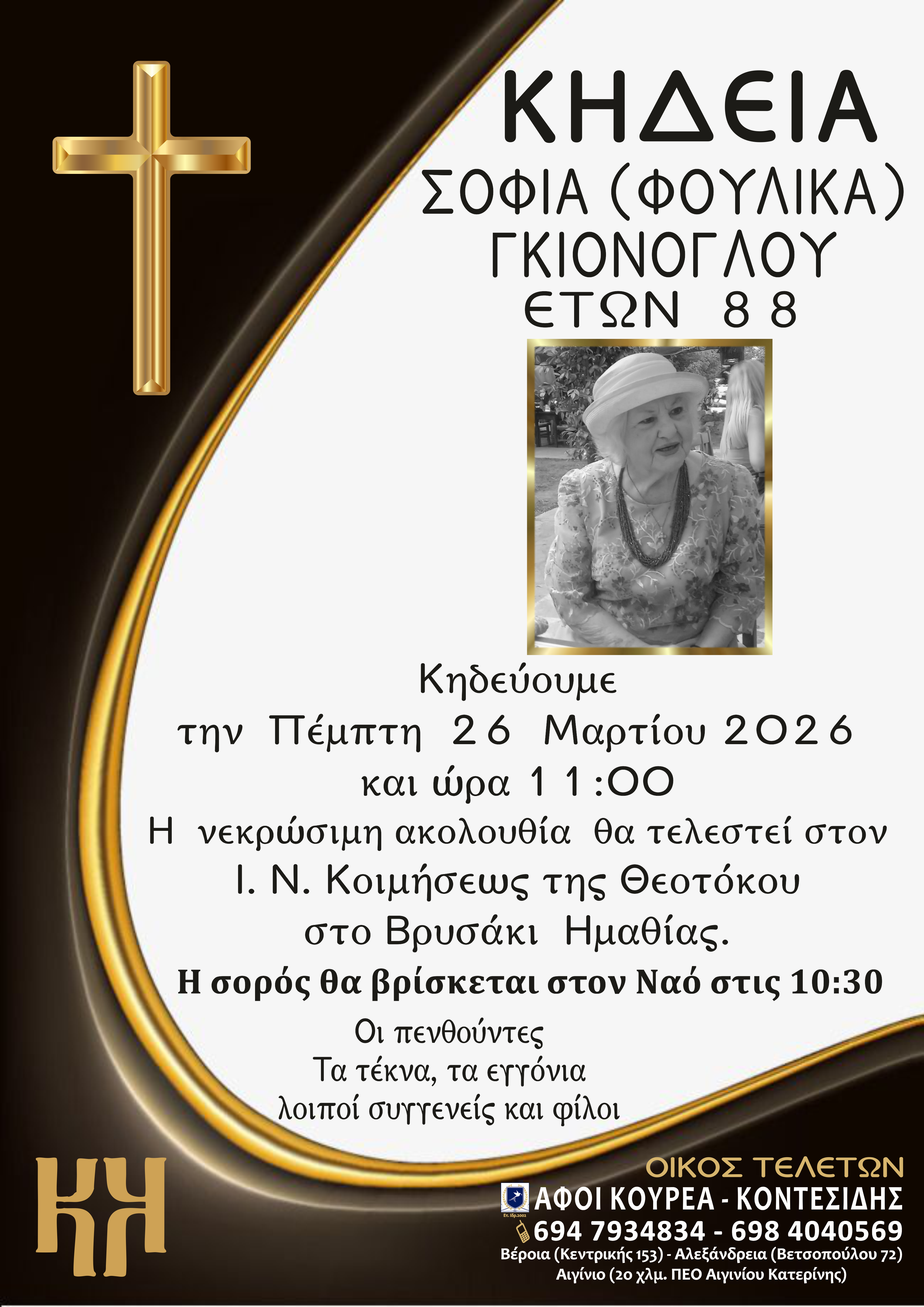 Κηδεύουμε την Πέμπτη 26 Μαρτίου 2026 και ώρα 11:00.