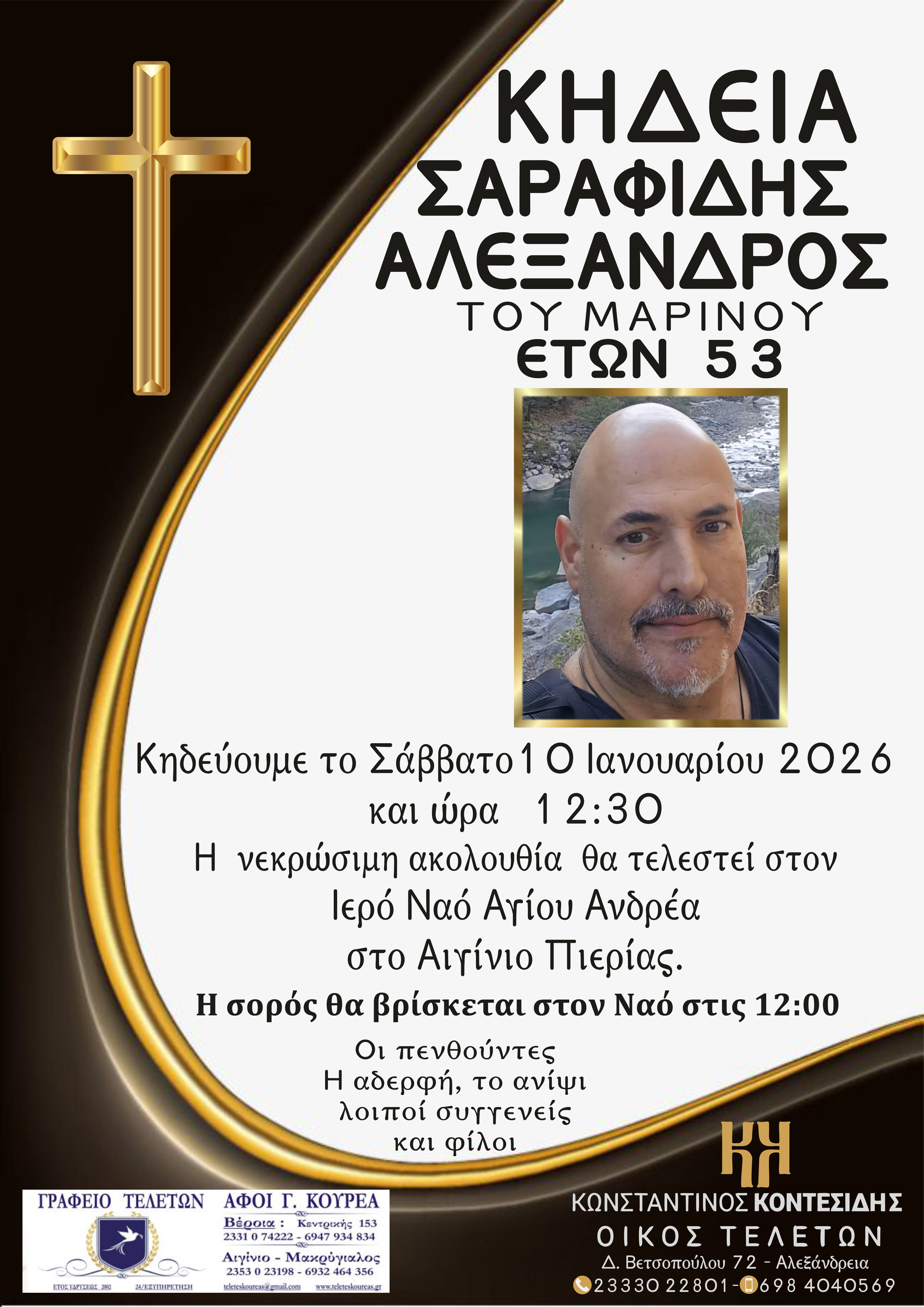 Η κηδεία του θα τελεστεί το Σάββατο 10 Ιανουαρίου 2026 και ώρα 12:30,