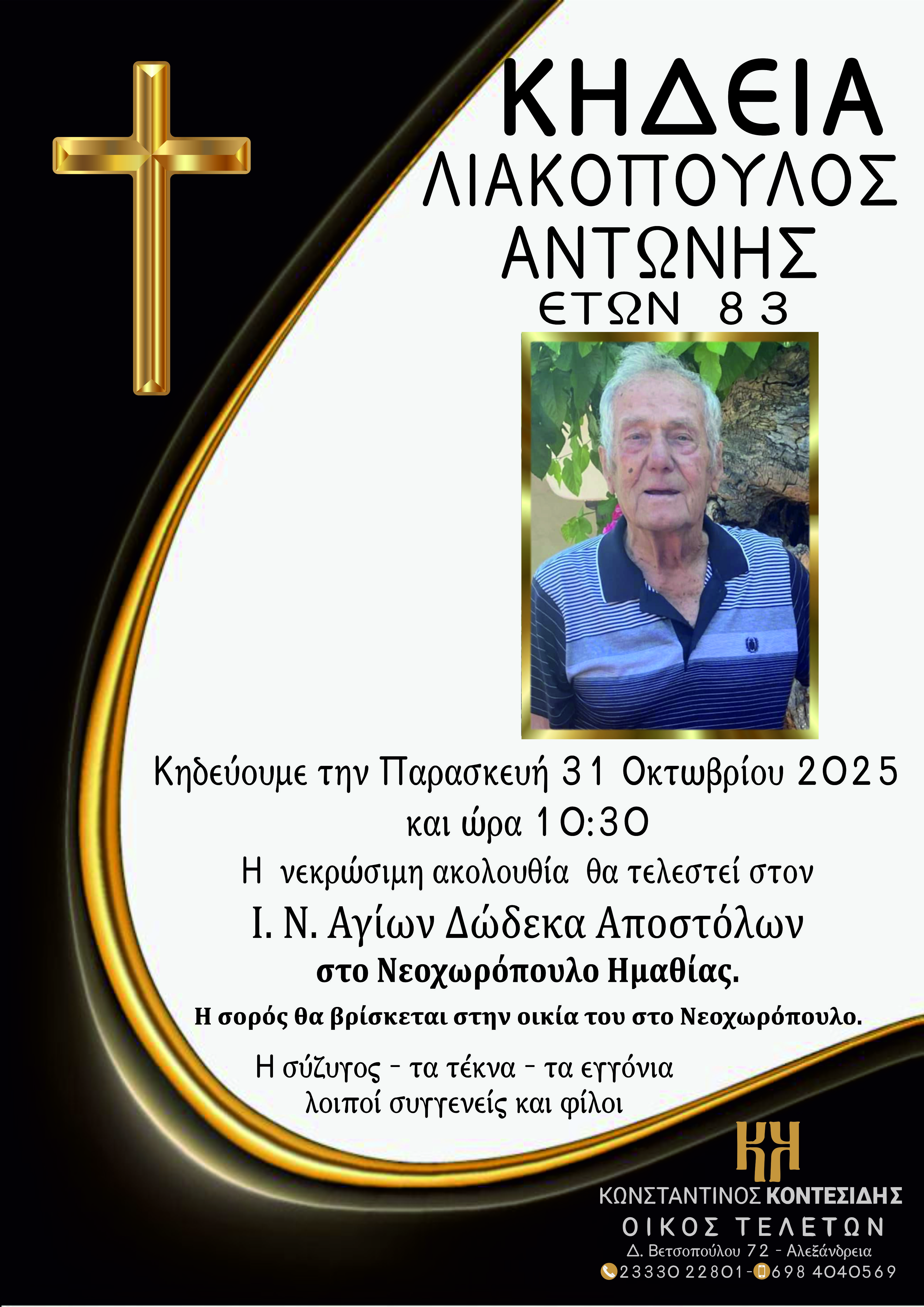 Η κηδεία του θα τελεστεί τη Δευτέρα 31 Οκτωβρίου 2025 και ώρα 10:30 π.μ., στον Ιερό Ναό Αγίων Δώδεκα Αποστόλων στο Νεοχωρόπουλο Ημαθίας.