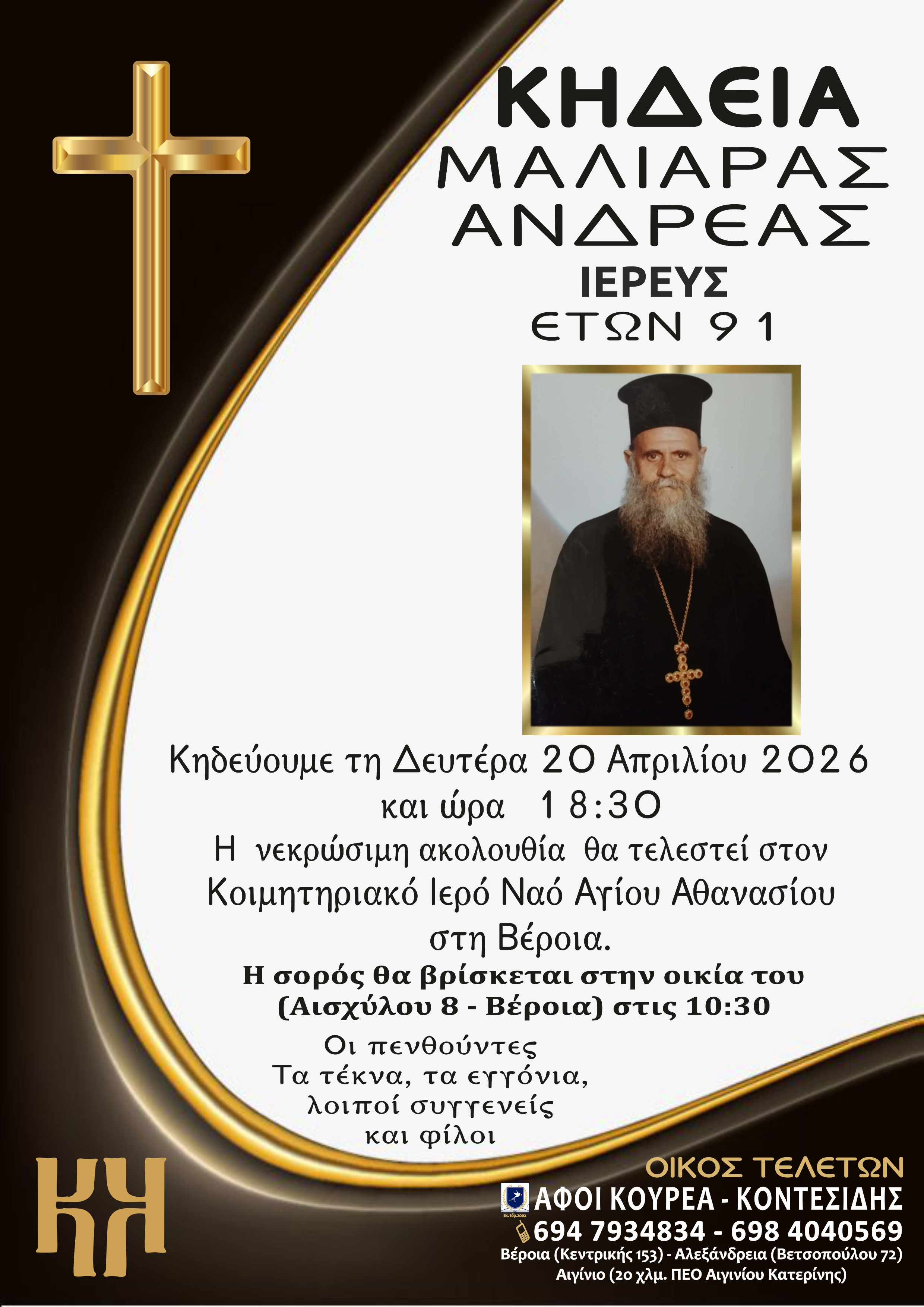 Η εξόδιος ακολουθία θα τελεστεί τη Δευτέρα 20 Απριλίου 2026 και ώρα 18:30, στον Κοιμητηριακό Ιερό Ναό Αγίου Αθανασίου στη Βέροια.