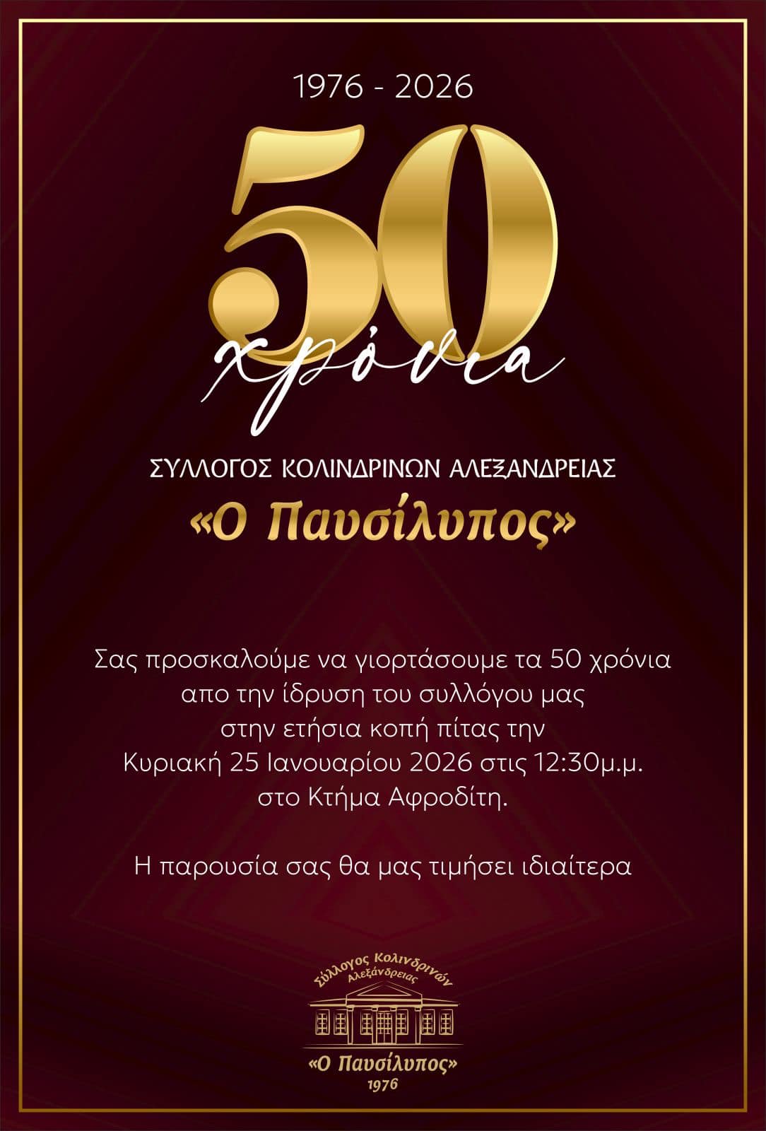 Θα ήταν μεγάλη μας τιμή και χαρά , να σας έχουμε όλους κοντά μας σε αυτή την επετειακή κοπή βασιλόπιτας του Συλλόγου μας !