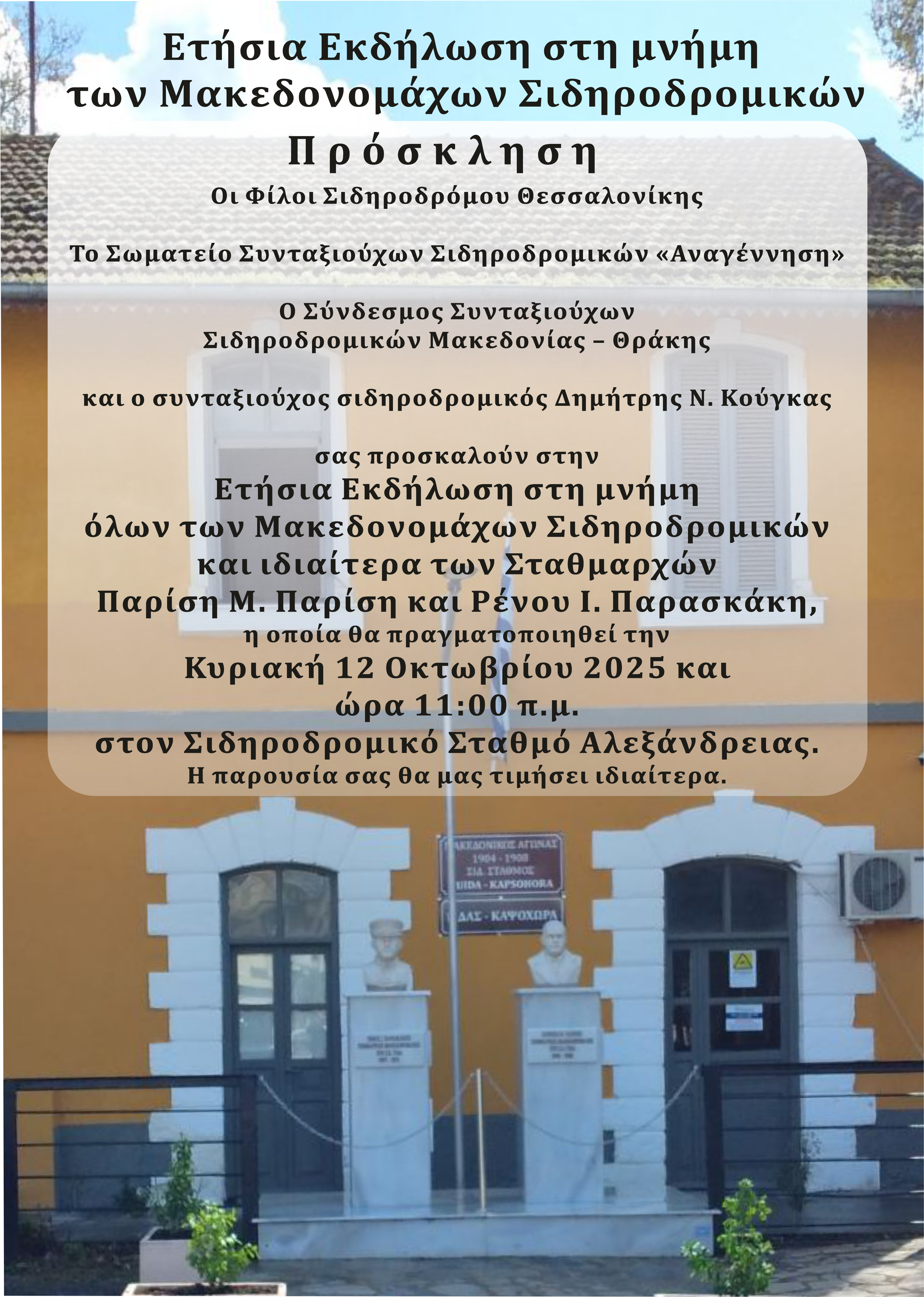 προσκαλούν το κοινό στην Ετήσια Εκδήλωση τιμής και μνήμης όλων των Μακεδονομάχων Σιδηροδρομικών