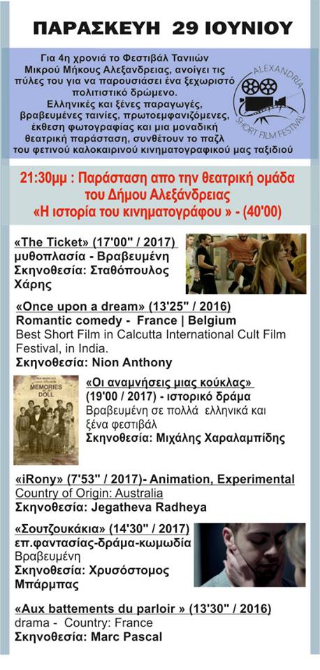 33 Ελληνικές και ξένες ταινίες μικρού μήκους , πολλές βραβευμένες και πρωτοεμφανιζόμενες , έκθεση φωτογραφίας , masterclass και ένα μοναδικό θεατρικό δρώμενο από την θεατρική ομάδα του Δήμου Αλεξάνδρειας συνθέτουν το πολιτιστικό παζλ του φετινού καλοκαιρινού μας ταξιδιού.