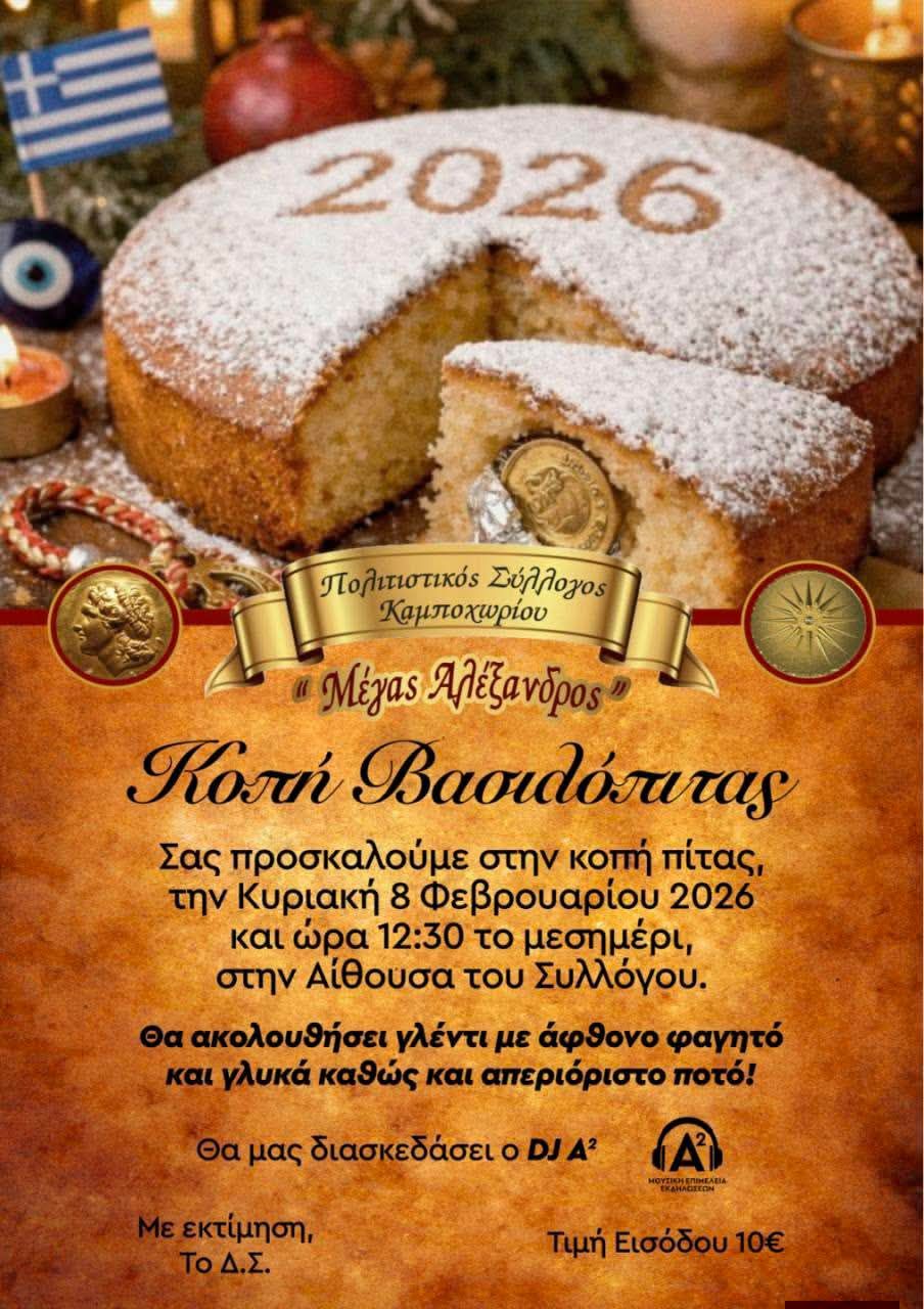 Ο Πολιτιστικός Σύλλογος Καμποχωρίου «Μέγας Αλέξανδρος» προσκαλεί τα μέλη και τους φίλους του στην καθιερωμένη Κοπή της Βασιλόπιτας