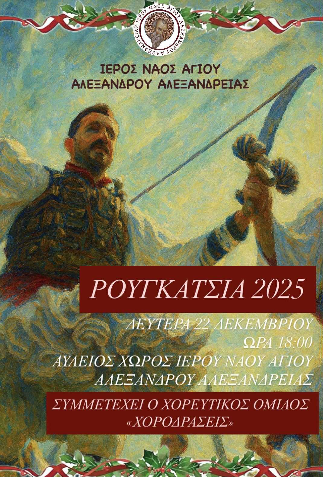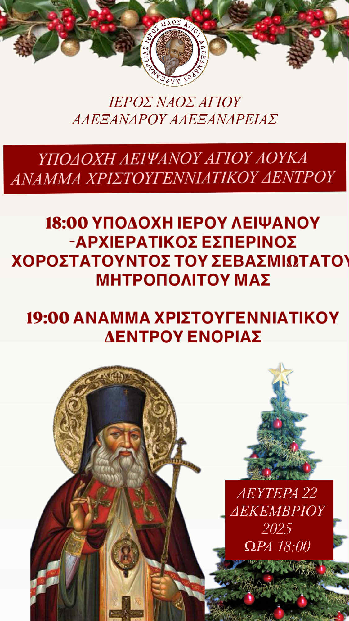 Μια σειρά από θρησκευτικές και πολιτιστικές εκδηλώσεις θα πραγματοποιηθούν τη Δευτέρα 22 Δεκεμβρίου 2025 στον Ιερό Ναό Αγίου Αλεξάνδρου Αλεξανδρείας, προσελκύοντας το ενδιαφέρον των πιστών αλλά και όσων αγαπούν τα τοπικά έθιμα.