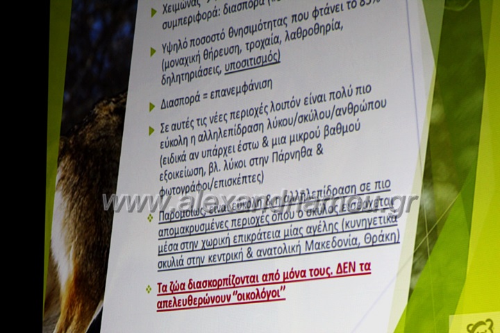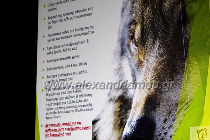 Στη συνέχεια έγινε αναφορά στο γεγονός ότι στην Ελλάδα υπάρχει τα τελευταία χρόνια αύξηση στα μέλη που αποτελούν τις αγέλες των λύκων, όμως και σε αυτή την περίπτωση δεν μπορούμε να μιλάμε για υπερπληθυσμό και τόνισε ότι ο λύκος δεν απειλεί τον άνθρωπο, είναι ένα άγριο ζώο το οποίο θέλει να διαβιοί στο φυσικό του περιβάλλον, γεγονός που πρέπει να γίνεται σεβαστό από τους ανθρώπους που οφείλουν να κατανοήσουν τη σημαντικότητα του λύκου στην τροφική αλυσίδα και της διατήρησης της ισορροπίας της.