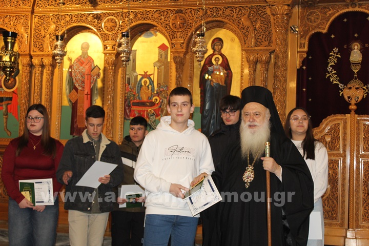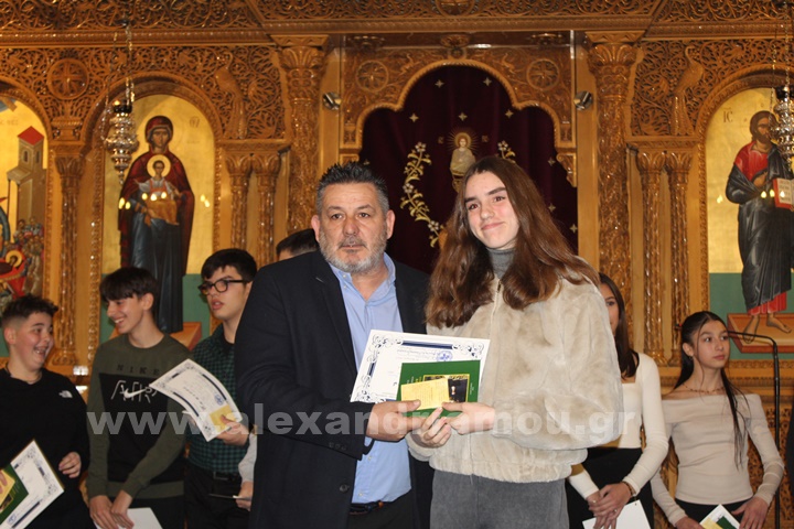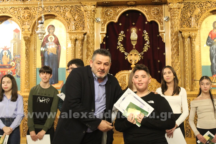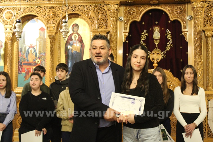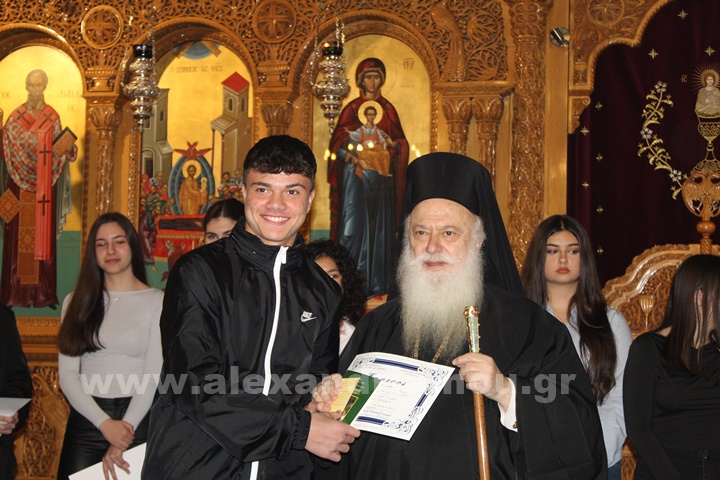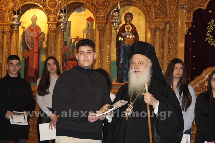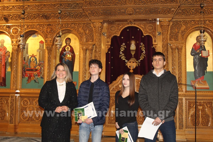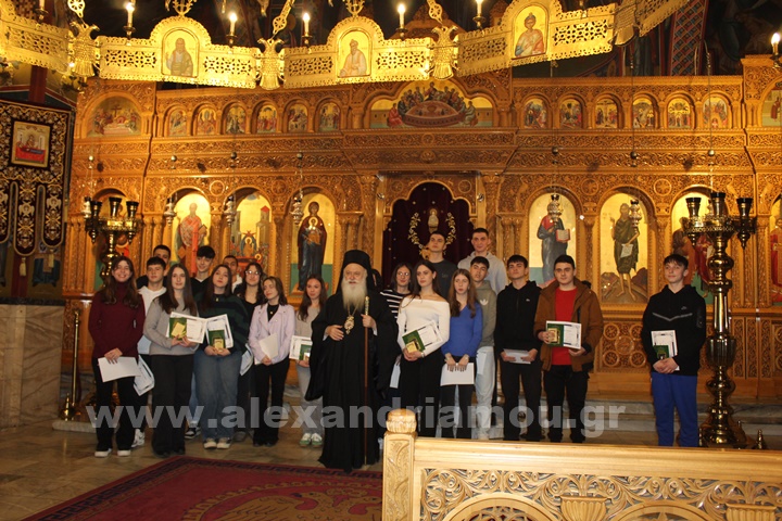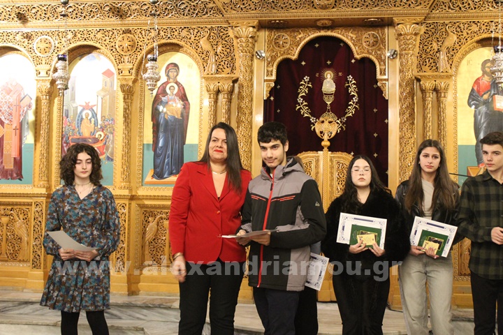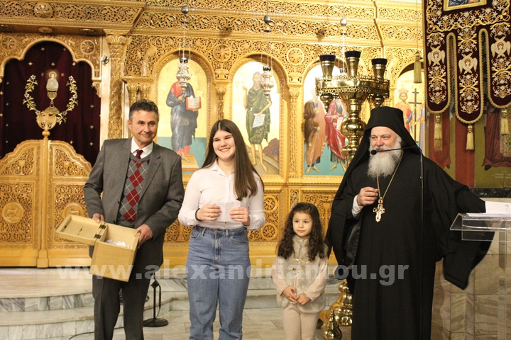 Η Μητρόπολη Βεροίας, Ναούσης και Καμπανίας, η Αρχιερατική Περιφέρεια και το εκκλησιαστικό συμβούλιο του Μητροπολιτικού Ιερού Ναού Κοιμήσεως της Θεοτόκου Αλεξανδρείας αφού πρώτα τελέστηκε Αρχιερατικός Εσπερινός χοροστατούντος του Σεβασμιωτάτου Μητροπολίτου Βεροίας, Ναούσης και Καμπανίας κ.κ. Παντελεήμονος, απένειμε τιμητικές διακρίσεις σε μια λαμπρή και καθιερωμένη πλέον εκδήλωση στα πλαίσια της εορτής των Τριών Ιεραρχών, προστατών της Ελληνορθόδοξης Παιδείας, την Τετάρτη 29 Ιανουαρίου 2025 στους αριστούχους μαθητές των Γυμνασίων της Αλεξάνδρειας που κατά το εκπαιδευτικό έτος 2023-2024 αρίστευσαν στο σχολείο και στο τμήμα όπου φοιτούν.