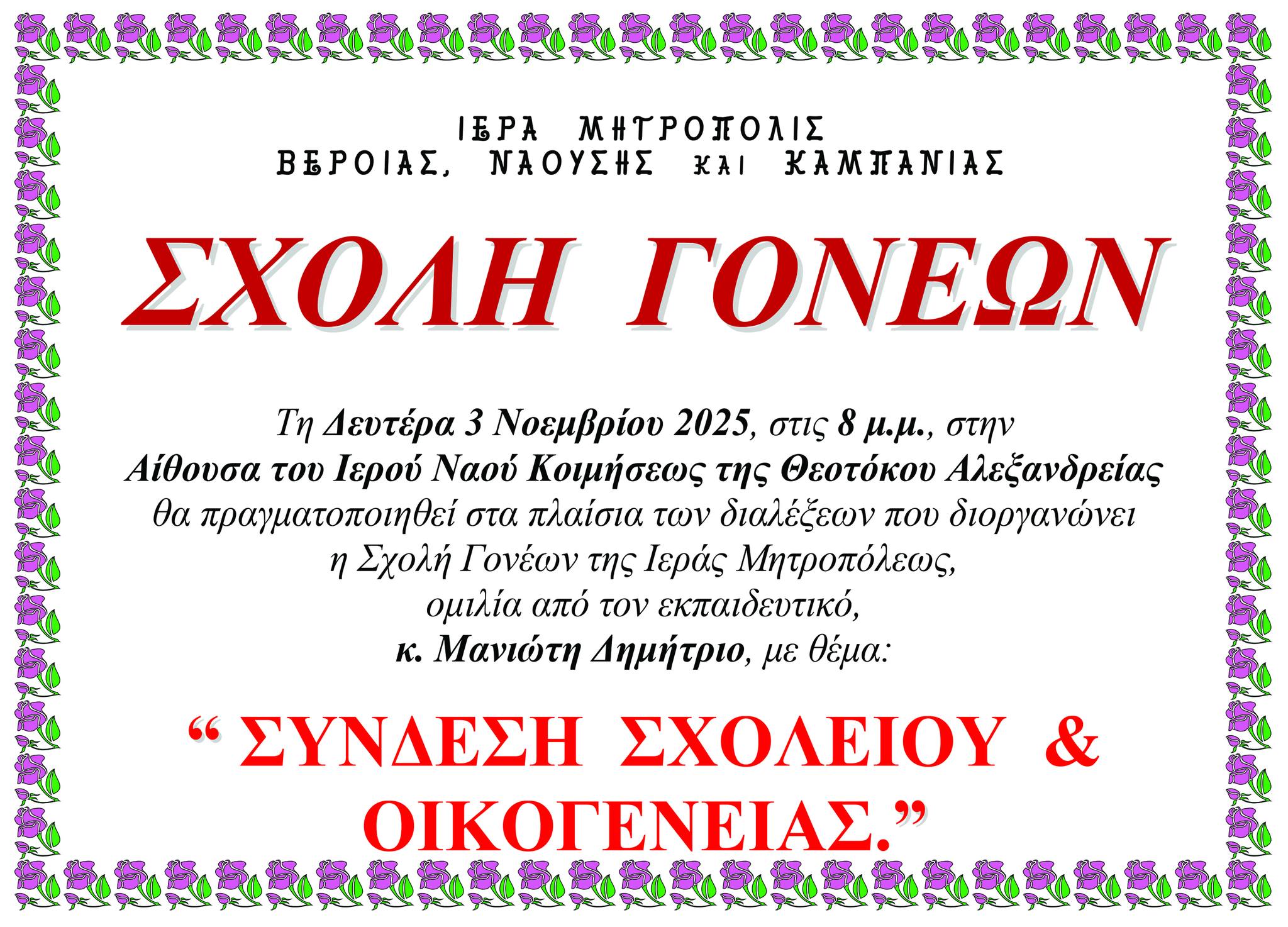 Από την Αρχιερατική Περιφέρεια Αλεξανδρείας ανακοινώνεται πως στα πλαίσια της Σχολής Γονέων της Ιεράς Μητροπόλεώς μας,
