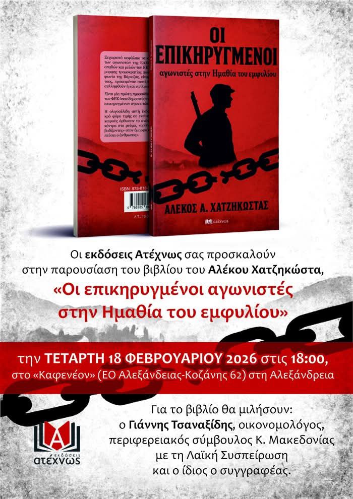 Οι εκδόσεις Ατέχνως προσκαλούν το κοινό στην παρουσίαση του νέου βιβλίου του Αλέκου Α. Χατζηκώστα με τίτλο Οι επικηρυγμένοι αγωνιστές στην Ημαθία του εμφυλίου, μια σημαντική ιστορική καταγραφή που φωτίζει άγνωστες πτυχές της περιόδου του Εμφυλίου στην περιοχή της Ημαθία.