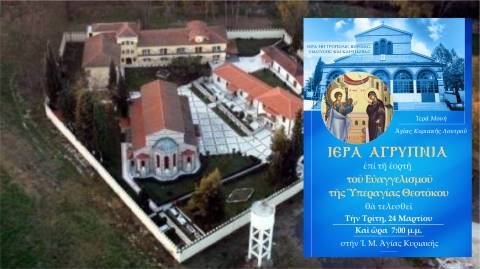 Την Κυριακή 6 Ιουλίου στις 7:00 μ.μ. θα χοροστατήσει στον Εσπερινό στην πανηγυρίζουσα Ιερά Μονή Αγίας Κυριακής Λουτρού.