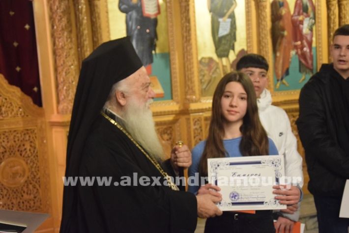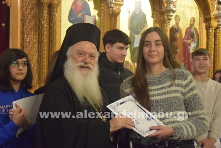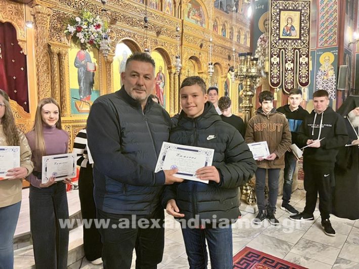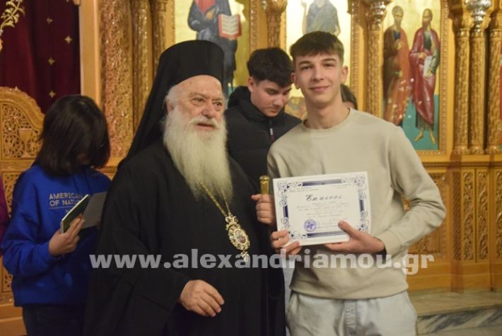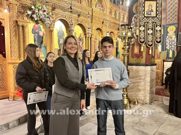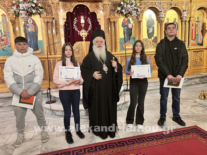 Η Μητρόπολη Βεροίας, Ναούσης και Καμπανίας, η Αρχιερατική Περιφέρεια και το εκκλησιαστικό συμβούλιο του Μητροπολιτικού Ιερού Ναού Κοιμήσεως της Θεοτόκου Αλεξανδρείας αφού πρώτα τελέστηκε Αρχιερατικός Εσπερινός χοροστατούντος του Σεβασμιωτάτου Μητροπολίτου Βεροίας, Ναούσης και Καμπανίας κ.κ. Παντελεήμονος, απένειμε τιμητικές διακρίσεις σε μια λαμπρή και καθιερωμένη πλέον εκδήλωση στα πλαίσια της εορτής των Τριών Ιεραρχών, προστατών της Ελληνορθόδοξης Παιδείας, την Τετάρτη 29 Ιανουαρίου 2025 στους αριστούχους μαθητές των Γυμνασίων της Αλεξάνδρειας που κατά το εκπαιδευτικό έτος 2023-2024 αρίστευσαν στο σχολείο και στο τμήμα όπου φοιτούν.