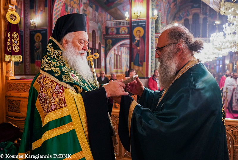 Στο τέλος του Εσπερινού ο Σεβασμιώτατος χειροθέτησε Πρωτοπρεσβύτερο τον π. Βασίλειο Παπαχρήστο και του ευχήθηκε με την ευκαιρία της νέας του διακονίας ως Προϊστάμενος του Ιερού Ναού του Αγίου Αλεξάνδρου Αλεξάνδρειας.