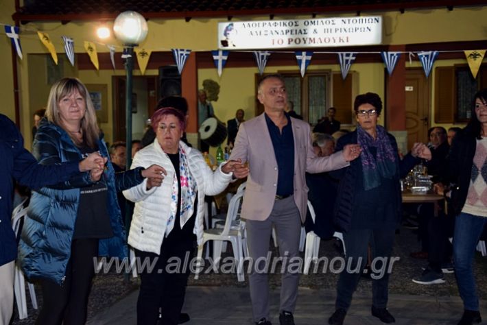 Ο Λαογραφικός Όμιλος Ντόπιων Αλεξάνδρειας και Περιχώρων "ΤΟ ΡΟΥΜΛΟΥΚΙ" προς τιμήν της 110ης επετείου της Απελευθέρωσης της πόλης μας από τον Τουρκικό ζυγό, για μια ακόμη φορά, πραγματοποίησε με μεγάλη επιτυχία, ένα εξαιρετικό παραδοσιακό γλέντι την Τρίτη 18 Οκτωβρίου 2022 στις φιλόξενες εγκαταστάσεις του Ομίλου το οποίο συνοδευόταν από μουσική, μεζέδες και κρασί.