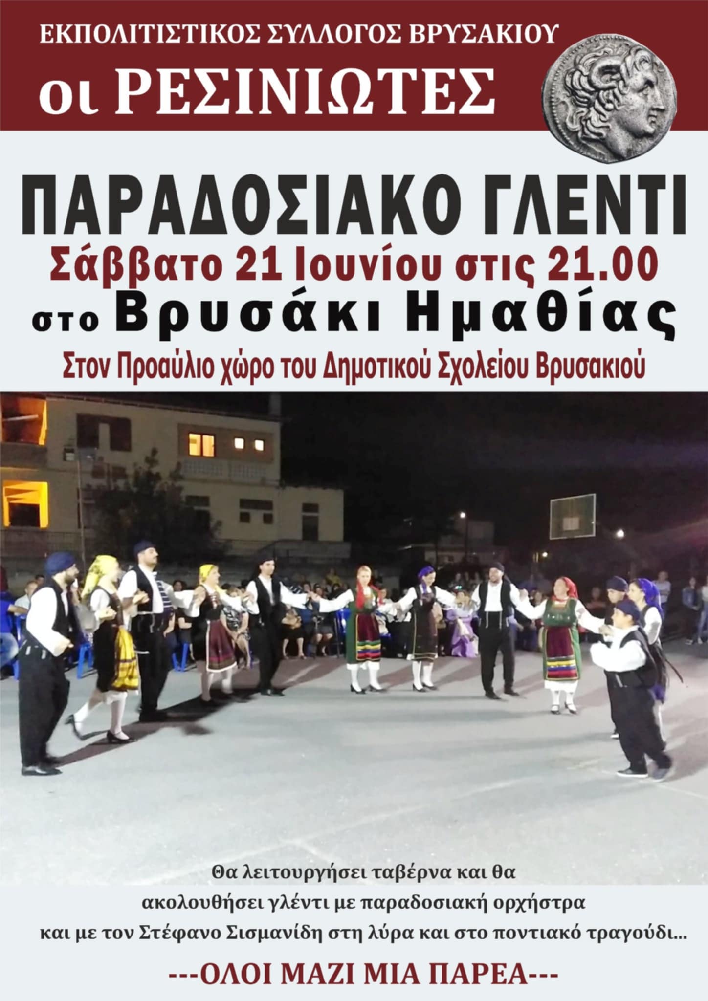 Το Σάββατο 15 Ιουνίου 2024 ο Εκπολιτιστικός Σύλλογος Βρυσακίου ¨ΟΙ ΡΕΣΙΝΙΩΤΕΣ¨ πραγματοποίησαν με μεγάλη επιτυχία και συμμετοχή ένα πανέμορφο παραδοσιακό γλέντι με χάλκινα και ποντιακή ορχήστρα στον αύλειο χώρο του Δημοτικού σχολείου Βρυσακίου.