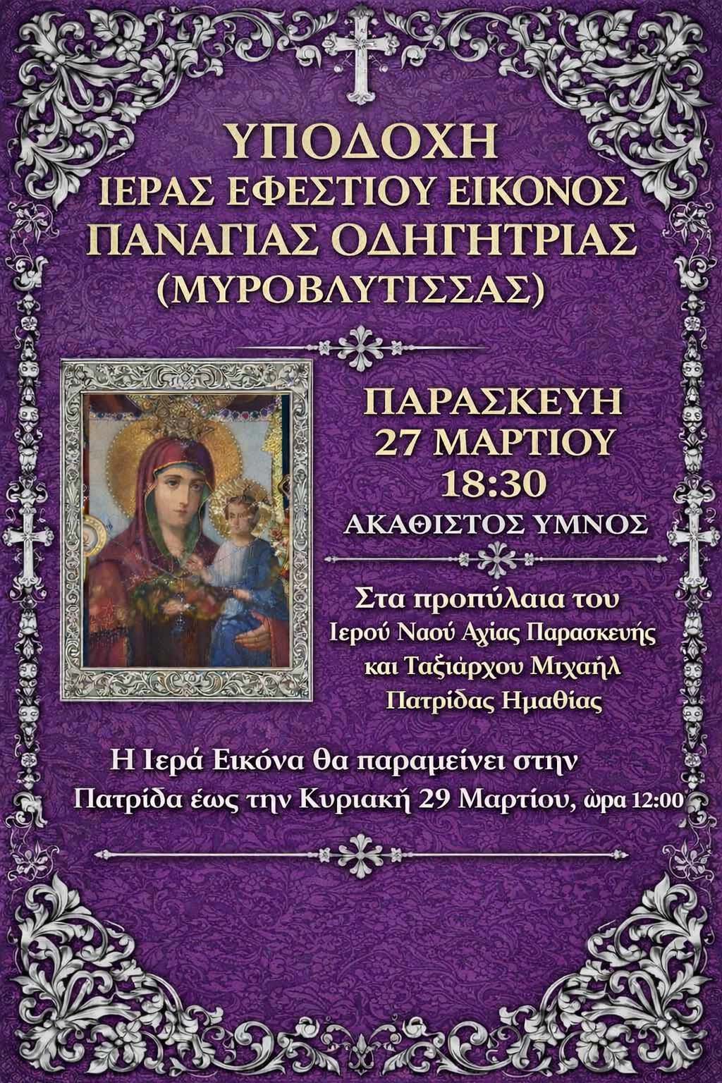 Με ιδιαίτερη κατάνυξη και λαμπρότητα θα πραγματοποιηθεί την Παρασκευή 27 Μαρτίου 2026 η υποδοχή της Ιεράς Εφεστίου Εικόνος της Παναγίας Οδηγήτριας (Μυροβλυτίσσης) στην Πατρίδα Ημαθίας.