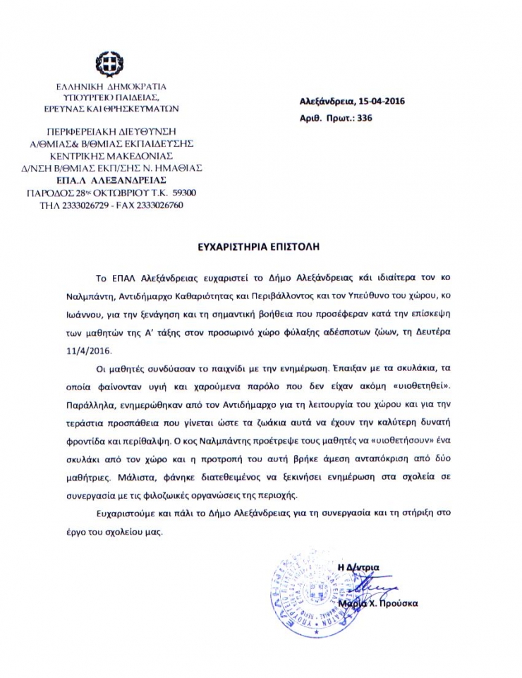 Ευχαριστήρια επιστολή του ΕΠΑΛ Αλεξάνδρειας προς το Δ. Αλεξάνδρειας