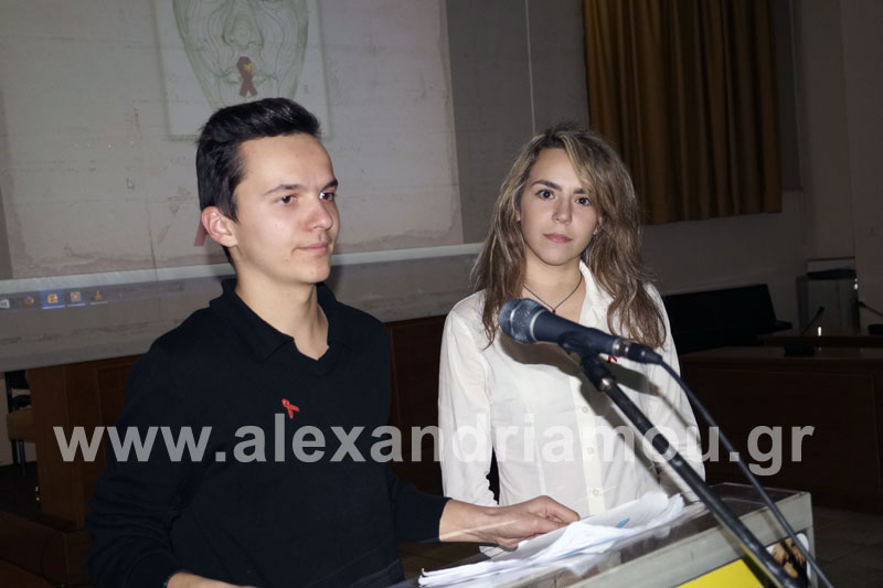 Η εκδήλωση πραγματοποιήθηκε στο Δημαρχείο Αλεξάνδρειας σήμερα Τρίτη 1 Δεκεμβρίου το απόγευμα με την συμμετοχή του Δρ. Κιοσέ Βασίλειου - Παθολόγου Λοιμοξιολόγου, ενώ αντίστοιχη ενημέρωση-ομιλία είχε προηγηθεί στους μαθητές στο χώρο του σχολείου το πρωϊ της ίδιας μέρας.