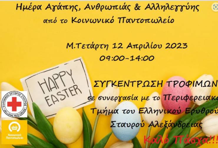 Ο Δήμος Αλεξάνδρειας μέσω του Κοινωνικού Παντοπωλείου της Διεύθυνσης Κοινωνικής Προστασίας Παιδείας και Πολιτισμού του Δήμου Αλεξάνδρειας, σε συνεργασία με το Περιφερειακό Τμήμα του Ελληνικού Ερυθρού Σταυρού, εν όψει των άγιων ημερών του Πάσχα, συνδιοργανώνουν δράση με σκοπό τη συγκέντρωση τροφίμων για τους συμπολίτες μας που στερούνται βασικών ειδών διατροφής με τίτλο “Ημέρα Αγάπης, Ανθρωπιάς και Αλληλεγγύης».
