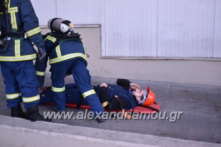 Η Π.Υ. Αλεξάνδρειας η οποία καταφθάνει αρχικώς με δύο οχήματα και ακολουθεί και τρίτο όχημα λόγω έντασης και έκτασης της συγκεκριμένης φωτιάς, επεμβαίνει συγκροτώντας α) ομάδα διάσωσης για τον εντοπισμό και απεγκλωβισμό του προαναφερόμενου εργαζόμενου και β) ομάδα προσβολής της φωτιάς.