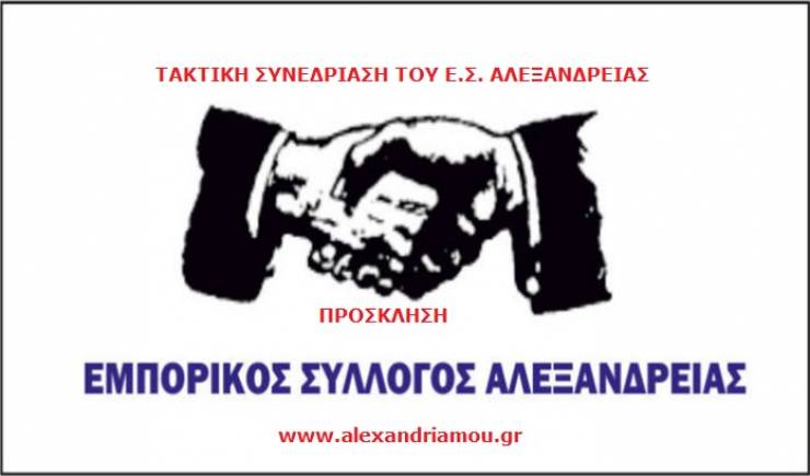 Σας καλούμε να προσέλθετε στην αίθουσα συνεδριάσεων του Διοικητικού Συμβουλίου του Εμπορικού Συλλόγου Αλεξάνδρειας σε τακτική συνεδρίαση, που θα γίνει την Πέμπτη 09 Νοεμβρίου 2017 και ώρα 20:30 με τα παρακάτω θέματα Ημερησίας Διάταξης: