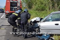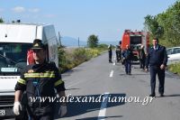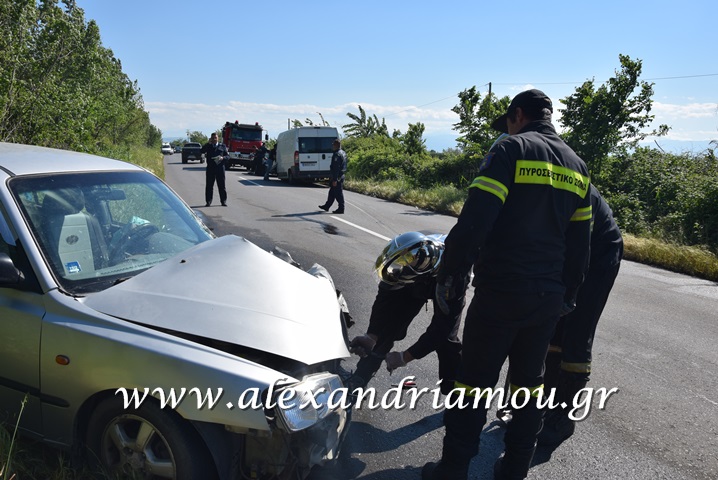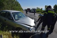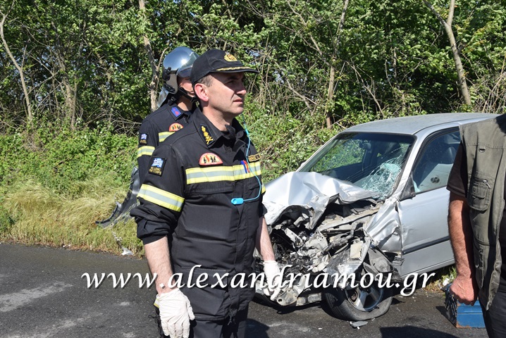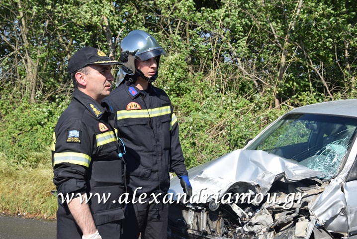 και ασθενοφόρο του ΕΚΑΒ το οποίο παρέλαβε και τους δύο τραυματίες ένα παιδάκι και μία γυναίκα και τους μετέφερε στο Κέντρο γείας Αλεξάνδρειας.Σύμφωνα με μαρτυρίες φωτιά εκδηλώθηκε στο πρανές παραπλεύρως του δρόμου με αποτέλεσμα να υπάρχει έλλειψηορατότητας και να επέλθει η σύγκρουση.
